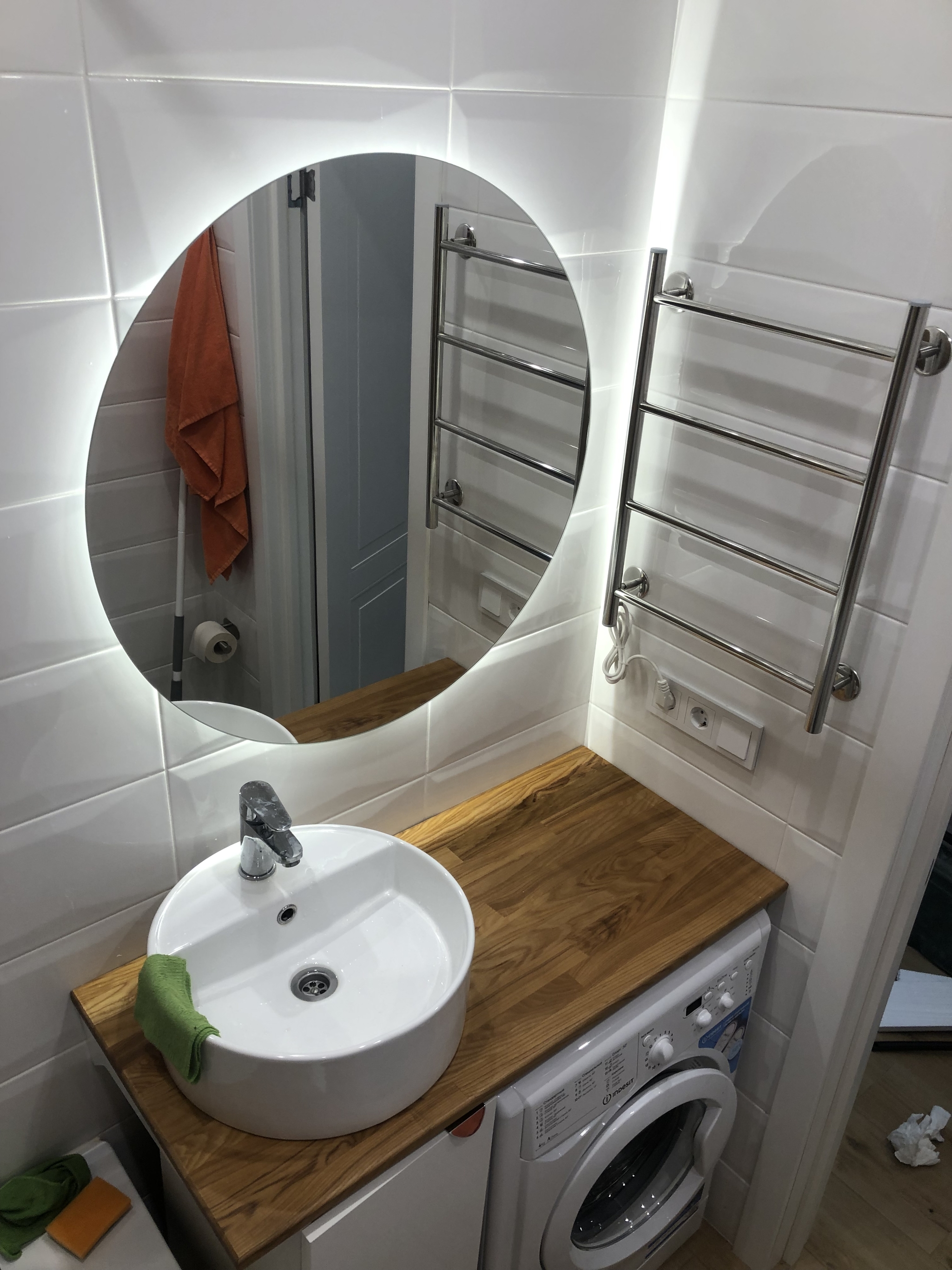 Из инструмента - маленькая болгарка с хорошим диском по керамике для резки плитки, маленький плиткорез, набор алмазных коронок. Сразу моя ошибка - надо было брать хороший плиткорез, с болгаркой дольше и грязнее (хоть я и резал под пылесос). Клей использовал UNIS, ничего плохого не могу сказать, ничего не отвалилось, наносится хорошо.