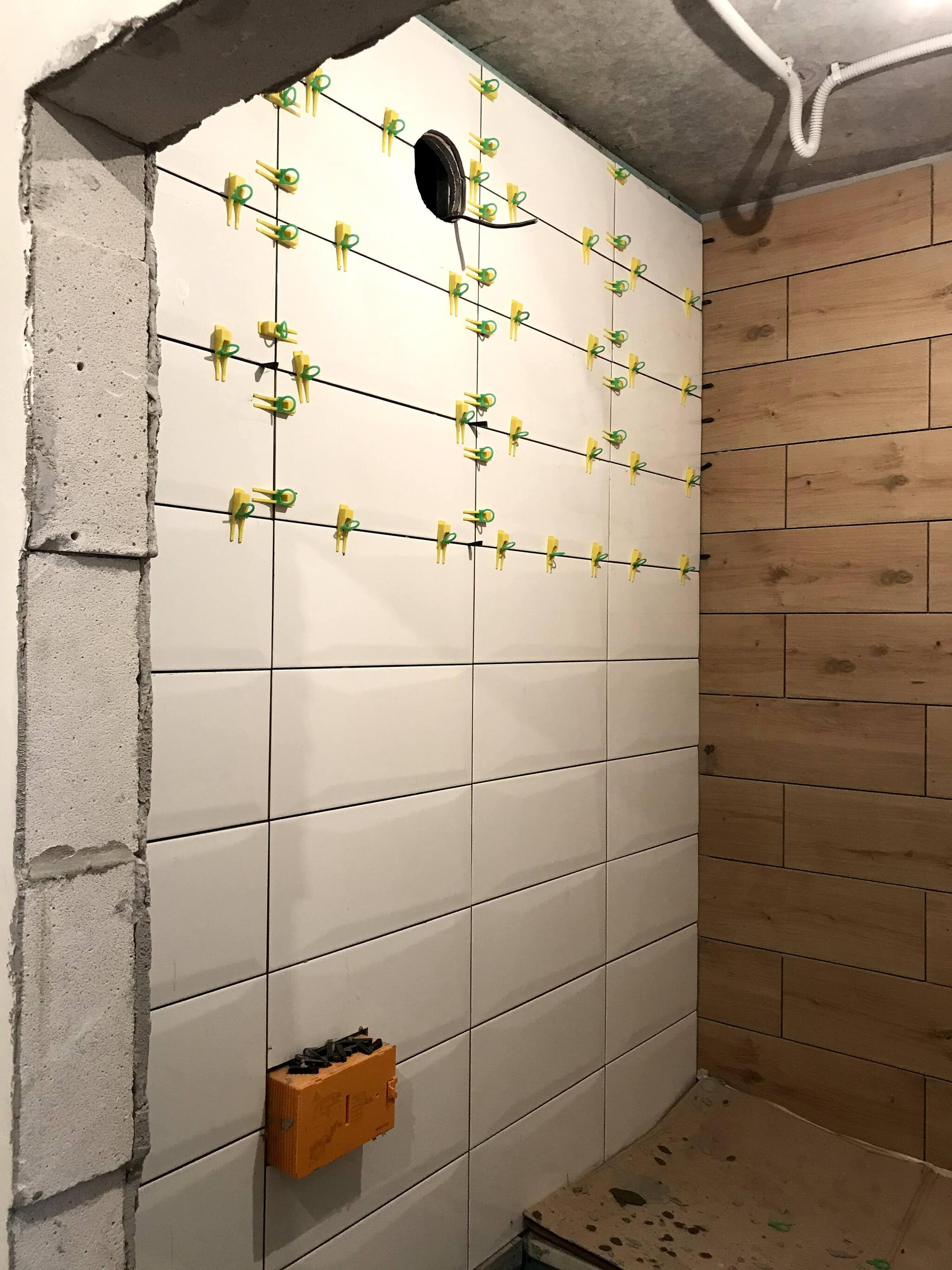 Итак, настало время плиточных работ. Сам это никогда не делал, поэтому было пересмотрено куча видео на ютубе и вроде схема в голове сложилась. Решил использовать СВП, класть плитку на гребёнку, все стены хорошо прогрунтованы перед этим.