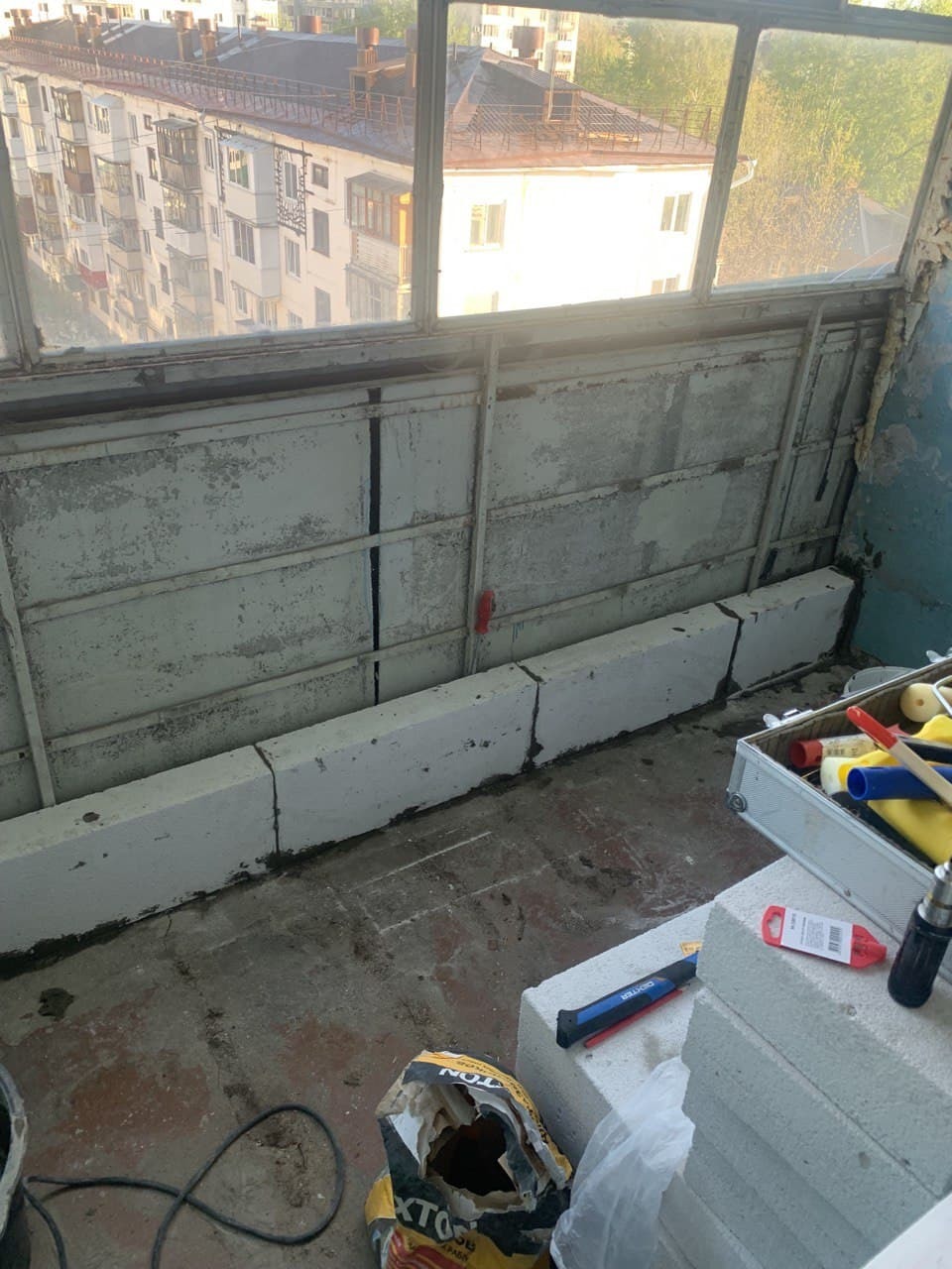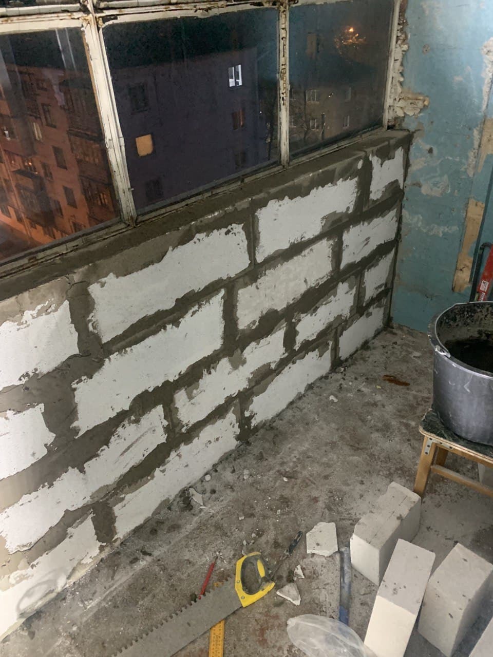 На этом этапе я вызвал замерщика окон. Мужик был крайне противный и все время пытался меня развести на какую-то мелочь и самое главное что с его слов - нужно ставить вот прям завтра. На вопрос можно ли установить раму 70мм с двумя камерами т.е. под 120кг весом на вот эту вот металл.конструкцию и шифер, он ответил: КООООНЕЕЕЧНОО!!! Но что-то мне подсказывало что эта рама потом улетит с 7 этажа вместе с рамами двух этажей ниже. Посоветовавшись с женой и с братишкой (он занимается обслуживанием пластиковых окон) я все же решил делать кладку из газобетона. Никогда ранее этим не занимался, а первая и последняя кладка которую я выкладывал это была кладка из кирпича для заделывания окна лет 15 назад. Получилось настолько криво, что до сих пор родственники ржут над мною. А дед до своей смерти меня материл. Ну делать надо и я приступил.