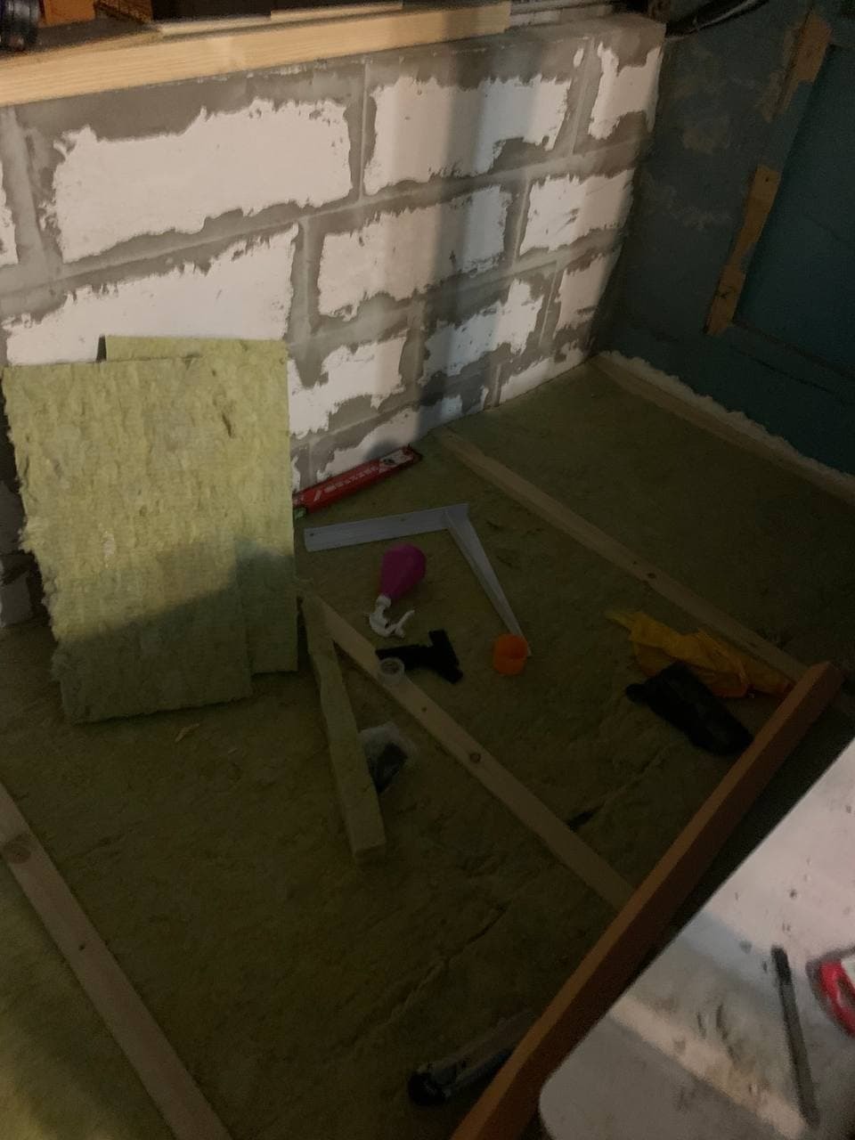Не удивляйтесь наличию на одной стене мин.ваты и технониколь. Просто осталось 2 листа мин.ваты, не выкидывать же. Некоторых может еще смутить наличию грибков на одной стороне и отсутствию с другой. Отвечу. с одной стороны деревянная дверь и клей пена его просто не удержит. Во вторых в процессе пришлось сменить фирму клей пены и вторая вообще нифига не держала. Пришлось крепить на грибки.