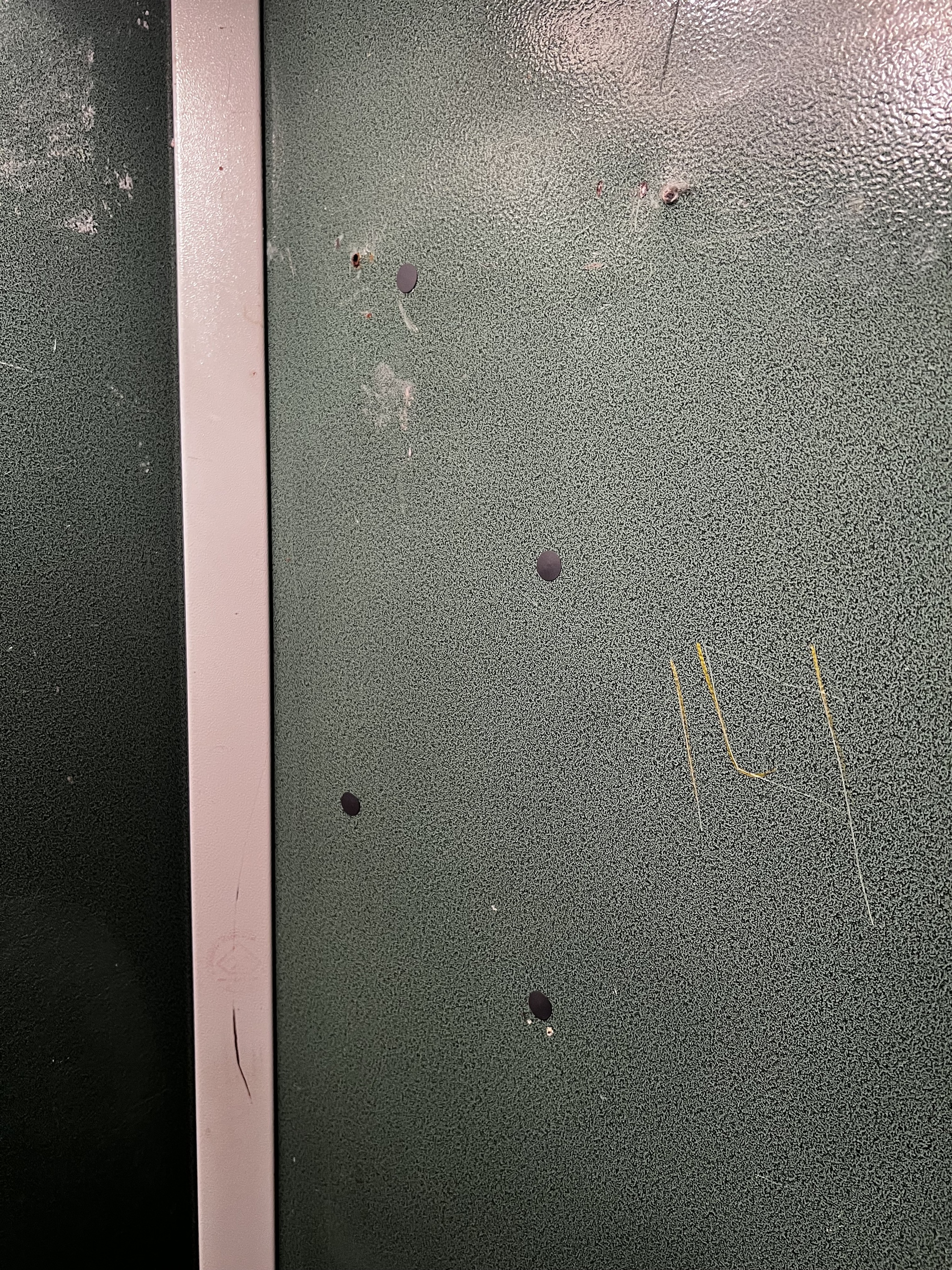 Попросил УК убрать косяки в лифте. Одно из требований было устранить отверстия, не предусмотренные конструкцией, оставшиеся от размещенной ранее рамки с рекламой. Требование выполнено!