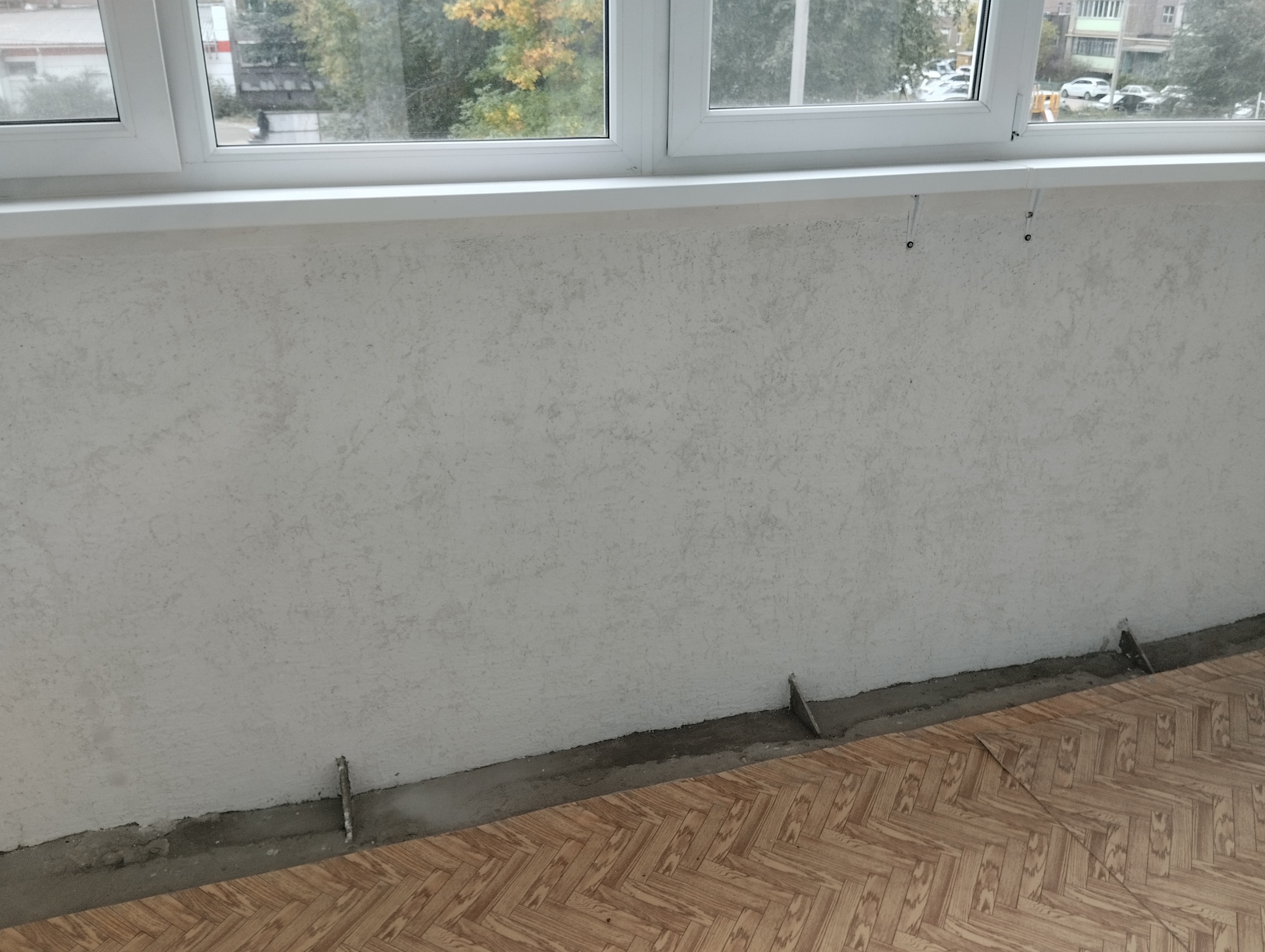 Всем привет, делаю ремонт на балконе. Наружная стена (ограждение) и пол соединены приваренными металлическими страшными треугольниками. Причем я нигде на подобных балконах больше такого не видел. Их надо было по хорошему до декоративной штукатурки спилить болгаркой, но я этого не сделал.