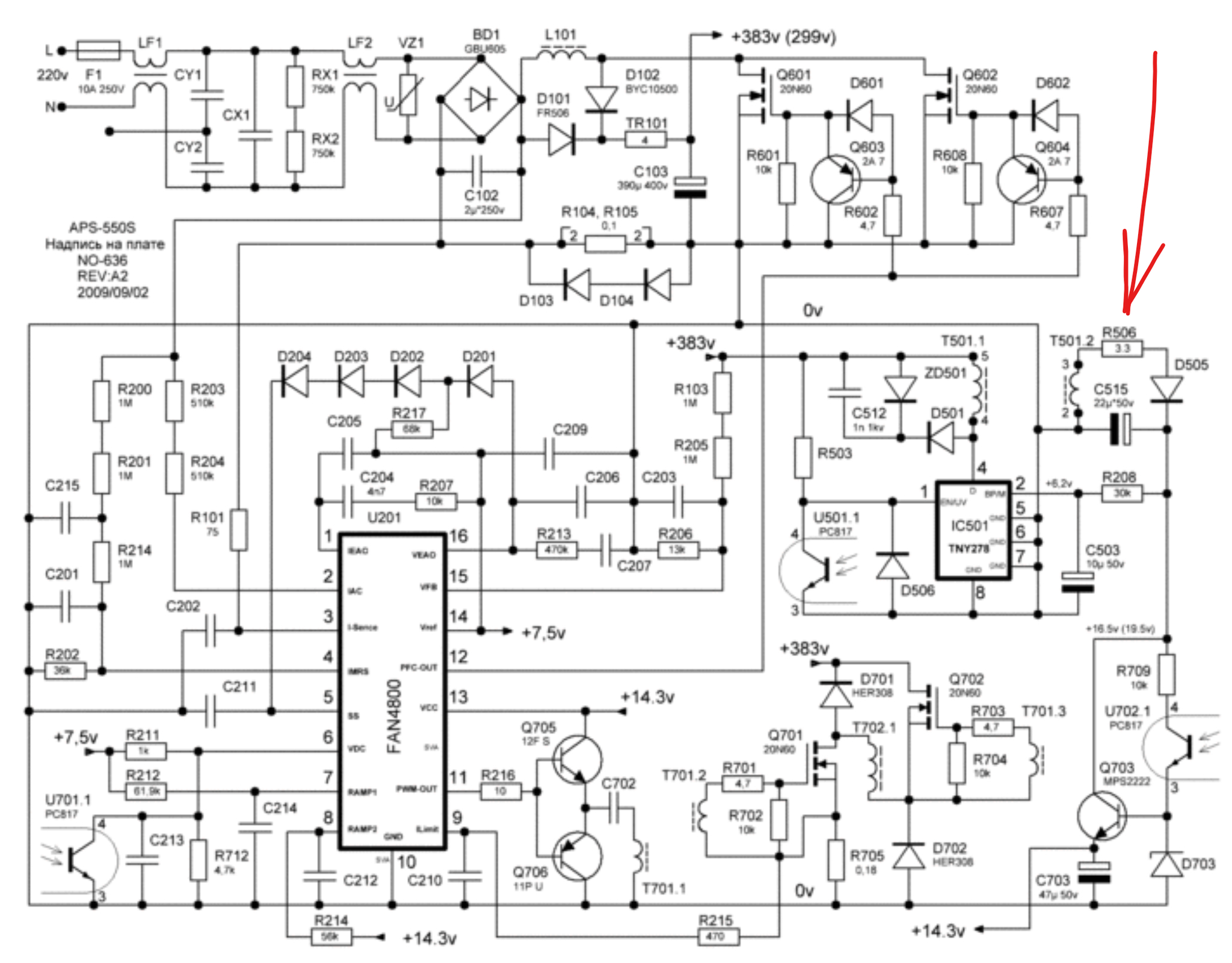 Подозрение резко упало на основной ШИМ. В качестве него в данном блоке используется FAN4800 - еще одна популярная дешевая микросхема. Обычно, если все остальное исправно, но блок не включается, то виновата именно она. Поскольку такая у меня также есть в наличии, я решаю просто заменить ее и посмотреть что будет. Отпаиваю вертикальную плату, на которой расположена данная ШИМка, и меняю.