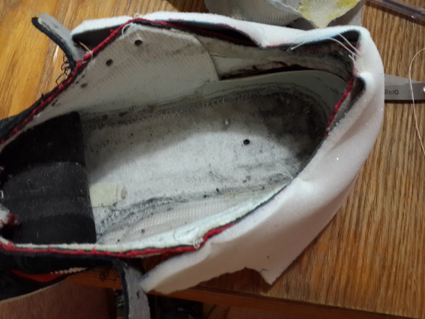 Приклеиваем поролон. Предварительно нужно приклеить его торцом к верхушке задника и потом уже опустить вниз и приклеить. Получится небольшой скос и выпуклость для фиксации пятки. Как то вот так: