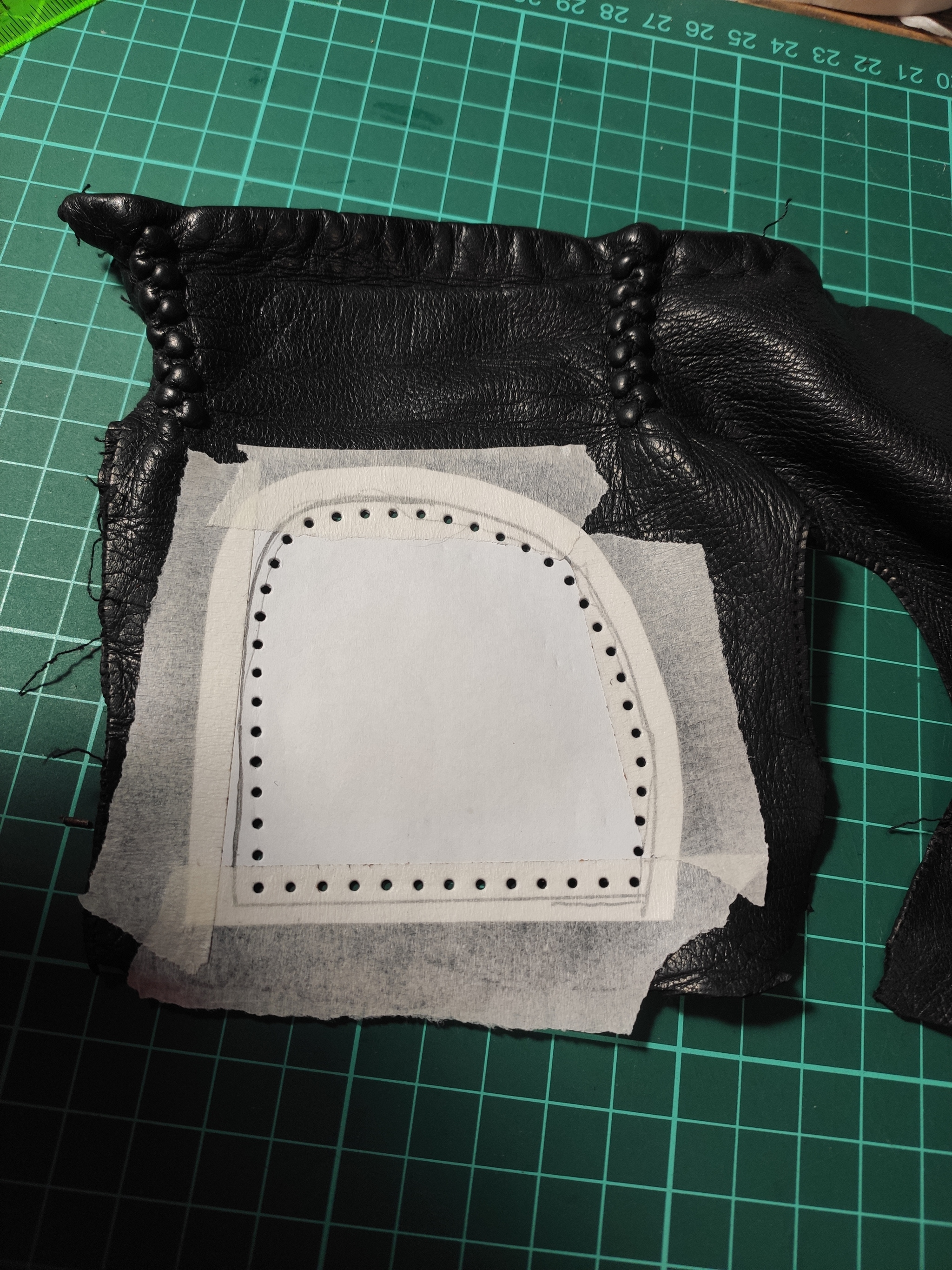 Прикинул размер, нарисовал выкройку и пробойником с шагом 5 мм сделал отверстия. По ощущениям кожа 0.6-0.8 мм.