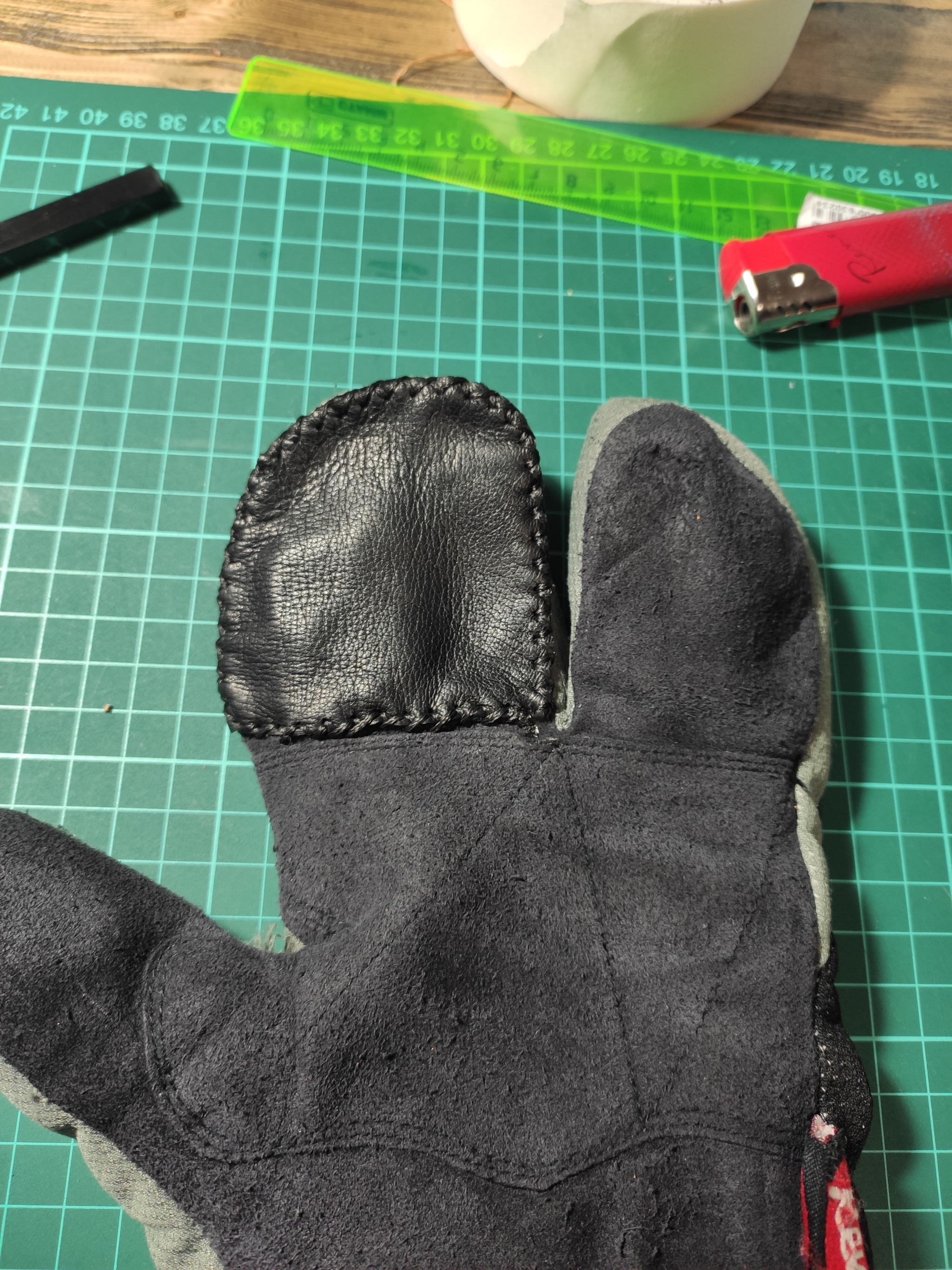 Порвались тренировочные лыжные перчатки( Посмотрев цены на новые, решил что проще и бюджетнее отремонтировать свои. В закромах была найдена одиночная кожаная печатка и благополучно распорота.