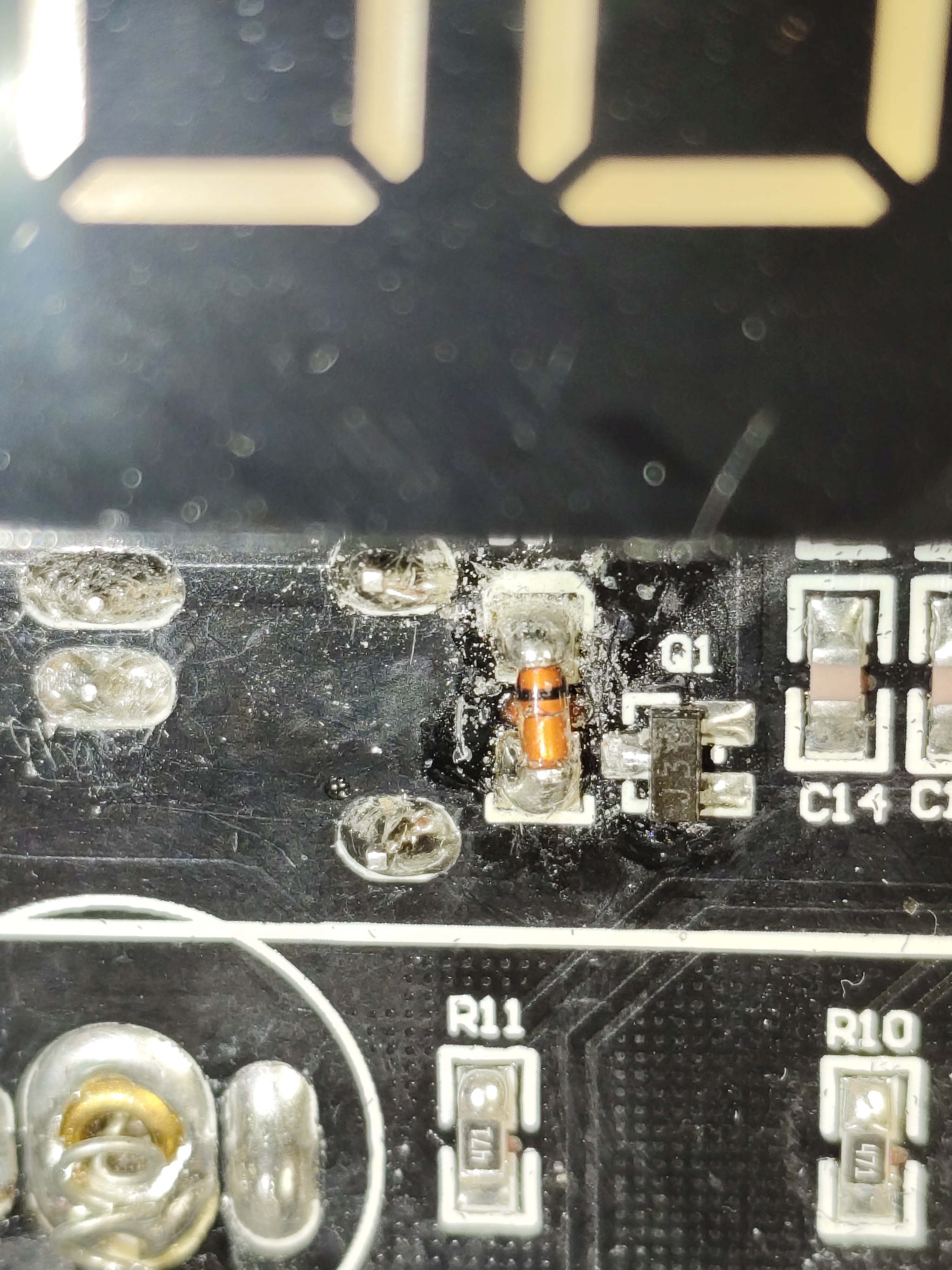 Первым делом проверил электромеханическое реле. Замкнул выводы 220В, всё заработало, свет, вентилятор, нагрев пошел. Проверил вход 12В на реле, не приходят. При осмотре обнаружил будто следы ремонта рядом с реле возле диода, как подтек после паяльной кислоты, но это неточно. Проверил диод в режиме прозвона диода, он в обе стороны пропускает ток.