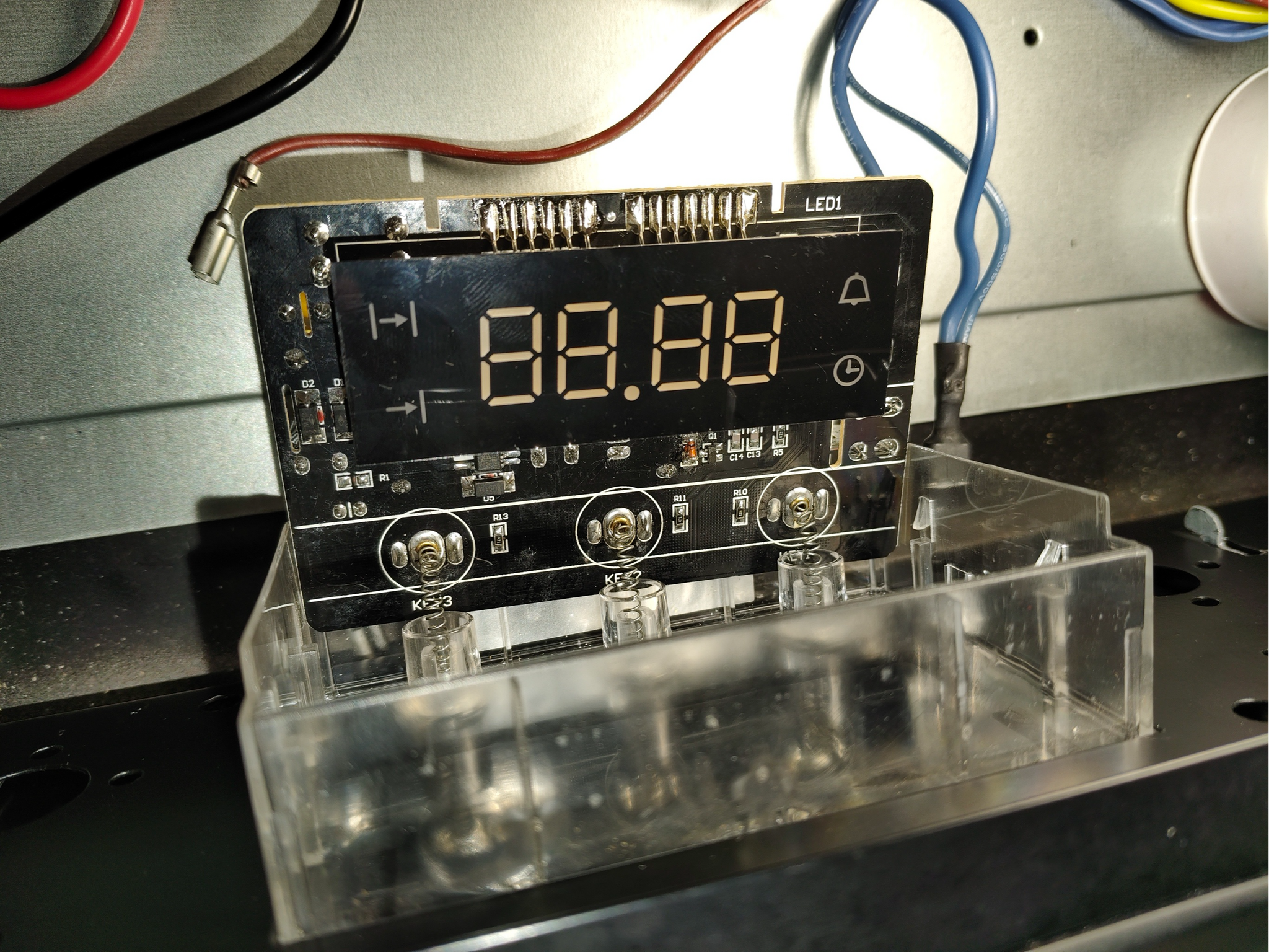 Разобрал духовку насколько смог. Столкнулся с проблемой снятия верхней стеклянной панели. Весь обнаруженный крепеж снял, но саму панель не смог, силовые методы побоялся что приведут к разрушению стекла, что равно выбросить духовку. Плату вынул из посадочного места и отогнул, она держится пружинами сенсорных кнопок.