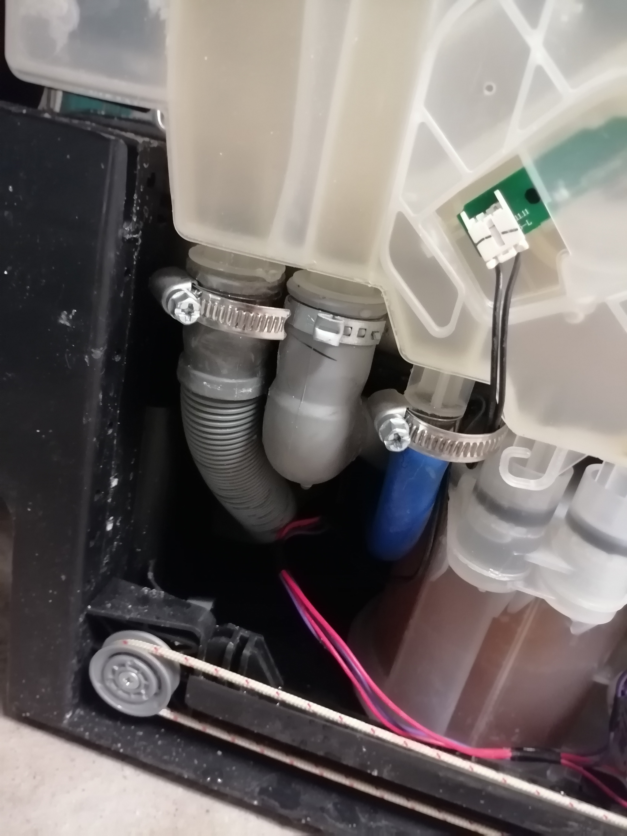 Провожаю её к подключению к воде и розетке. Подключаемся, пошёл залив. И пошёл он не вовнутрь а прямо под посудомойку. Соответственно ошибка e4 по аквастопу. Быстренько реагируем, обесточеваем. Скидываем боковушку видим отсутвие хомутов на заливе и сливе. Ставим хомуты, тестим все ок.