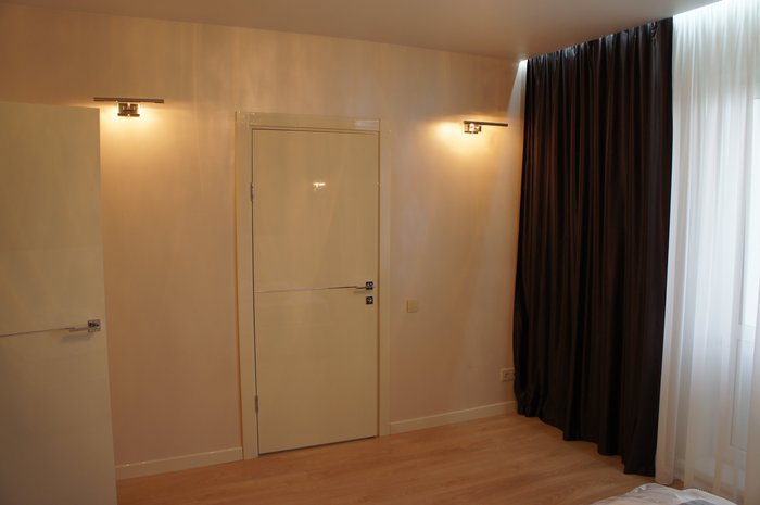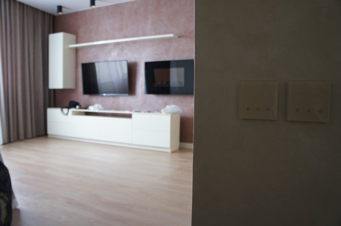 Из интересного: по всей квартире стоят сенсорные выключатели со стеклянной панелью. Выключатели беспроводные, то есть, их можно прилепить в любом месте, работают от батарейки. Но, при этом, для заказчика мы все равно заложили провода в стене. То есть, если ему надоест - можно сменить все на обычные проводные клавиши. На картинке - справа на стене