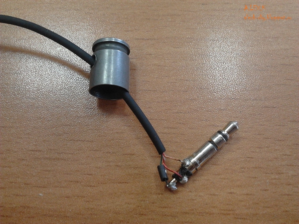 6. Склейка полученной конструкции. Сперва решил было все залить клеем B-7000, но данная затея потерпела неудачу. Клей не высыхал длительное время и оставался пластичным, что в нашем случае неприемлемо. Пришлось все очищать, перепаивать заново. К сожалению, забыл сделать фото после переделки. Для надежности крепления общий минус, я обжал небольшим кусочком термоусадки. Для изоляции канала наушника от корпуса гильзы из обычного стержня шариковой ручки отрезал небольшой кусочек. Получилось маленькое пластиковое колечко, через которое не пролазит основание штекера, но зато оно прекрасно центрируется.