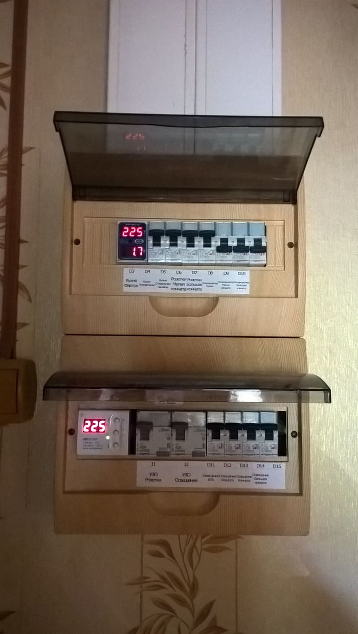 На фото ниже временный щит до ремонта в коридоре. Наклейки не соответствуют после установки амперметра.