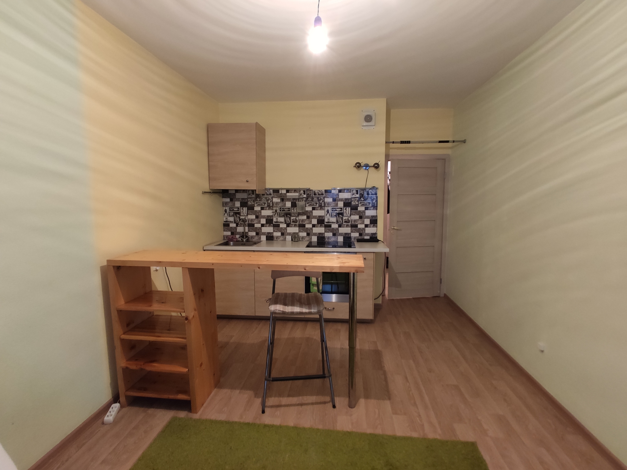 Стены окрашены тиккурилой, на полу ламинат, скос потолка зашит фанерой.
