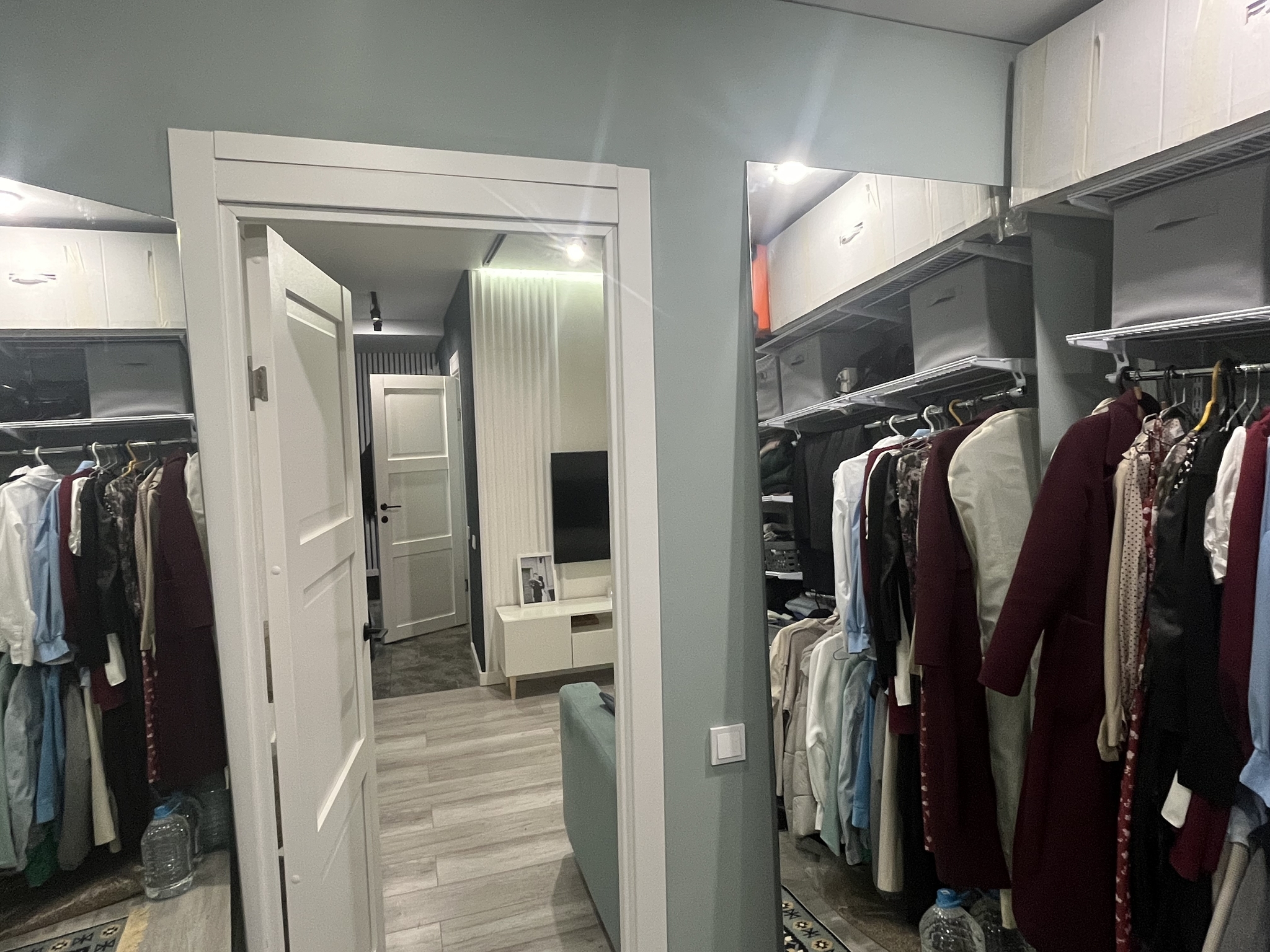 Гардеробная и спальня по 7 кв.м не просто так. Я думал не только про сегодня, но что будет через 5l-10 лет, если мы осядем в этой квартире на долго. Соответственно гардеробная превращается в спальню, а спальня в детскую. Я думал про вентиляцию, ведь окна нет, но не знал что это настолько критично. Если бы квартира была торцевая и окно было, то отличный вариант.