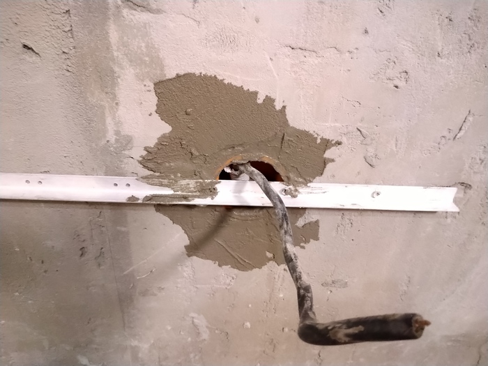 Выставил подрозетник по уровню и по плоскости стены алюминиевым уголком-кондуктором.