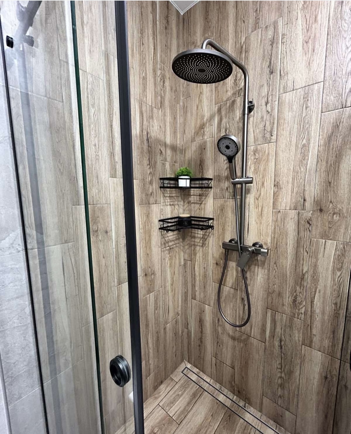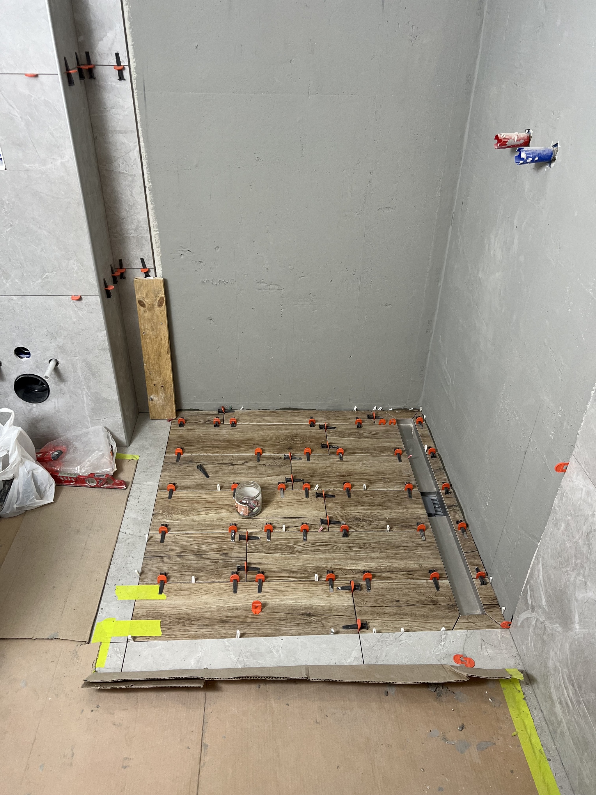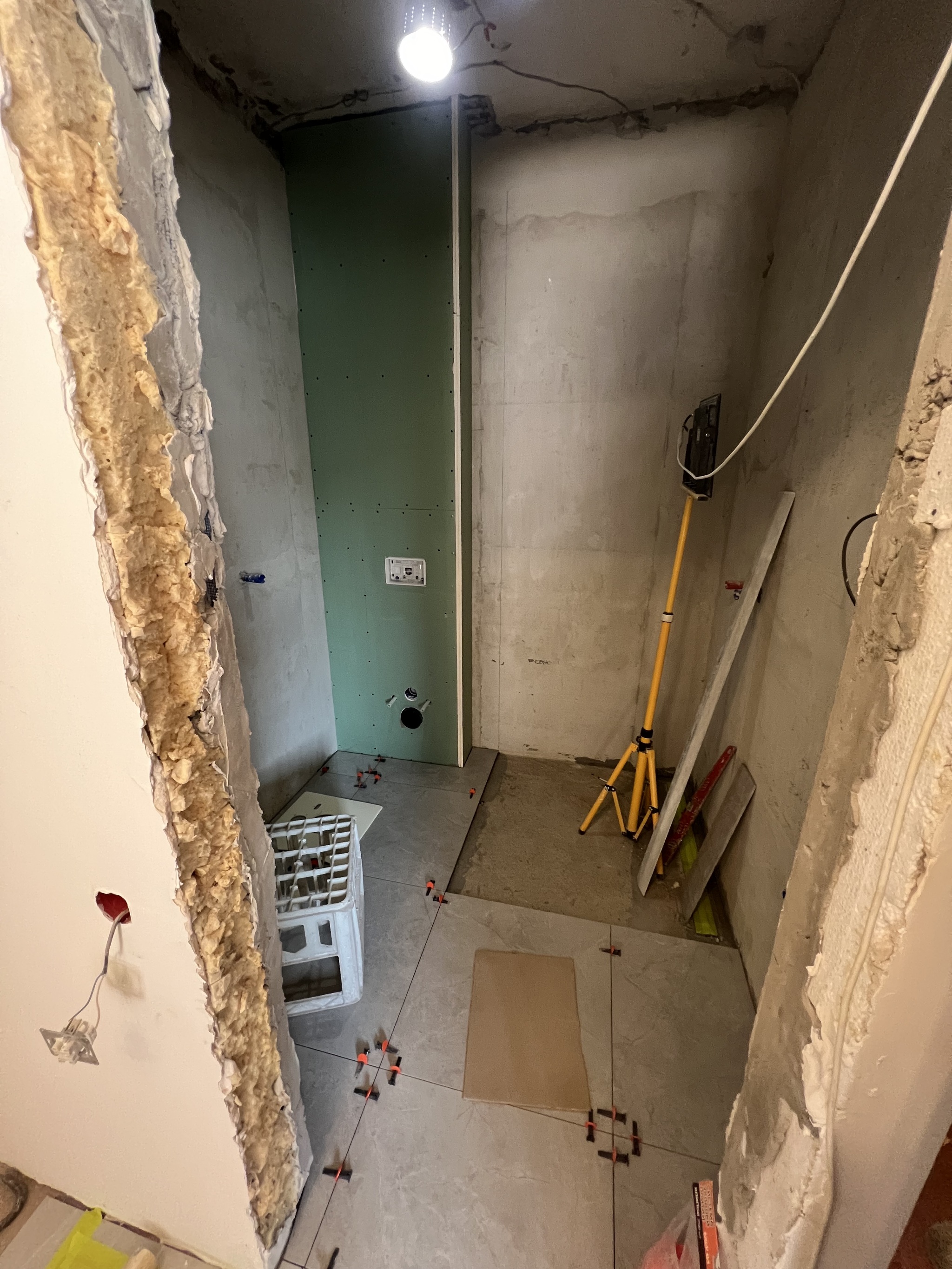 Приступил к укладке плитки на стенах и в душевой зоне.