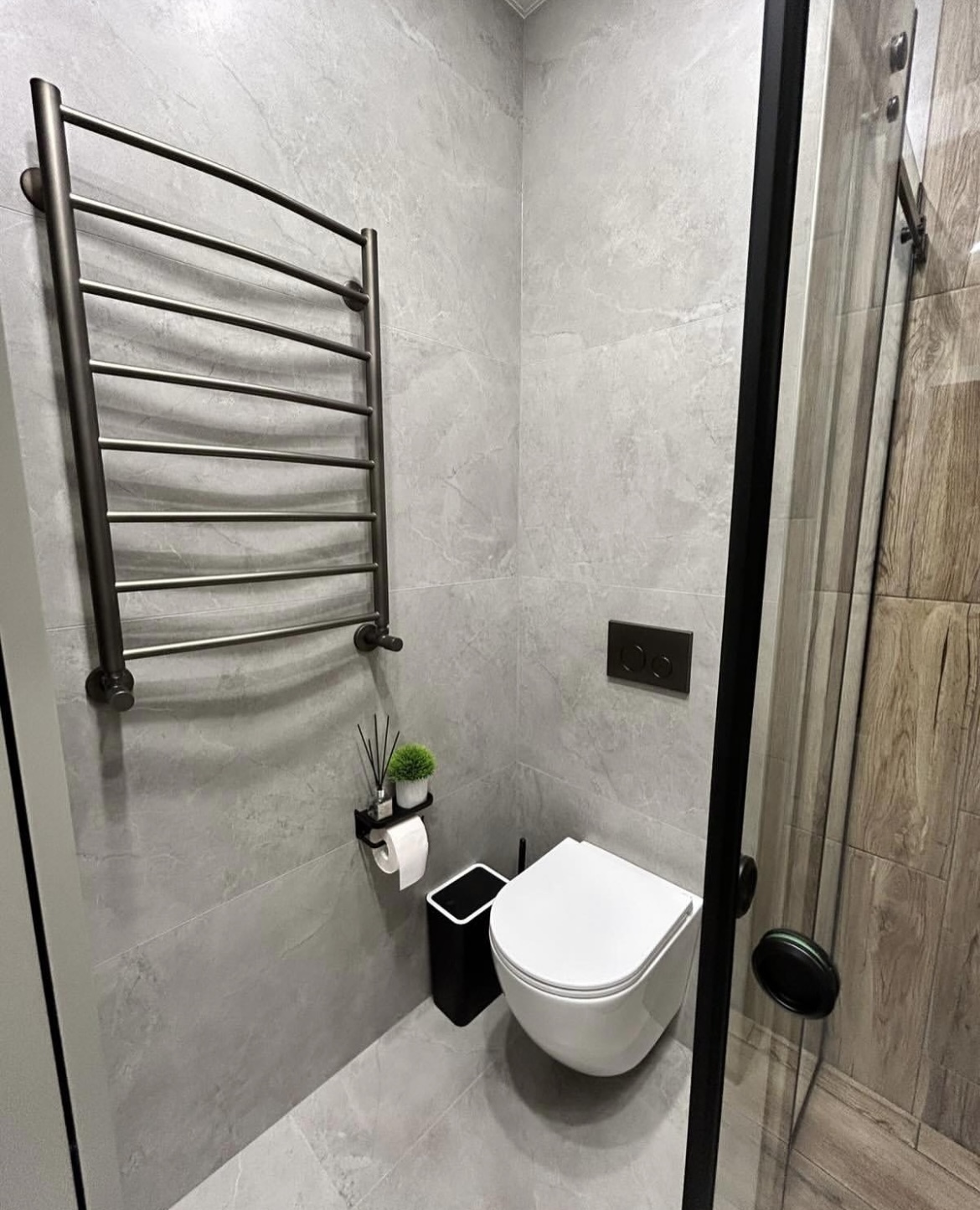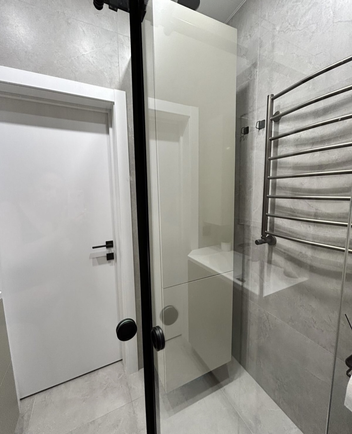 После чего зашил гипсокартоном инсталляцию и трубы. Обработал гидроизоляцией «мокрые места», поклеил гидроизоляционную ленту. Уложил плитку на пол.