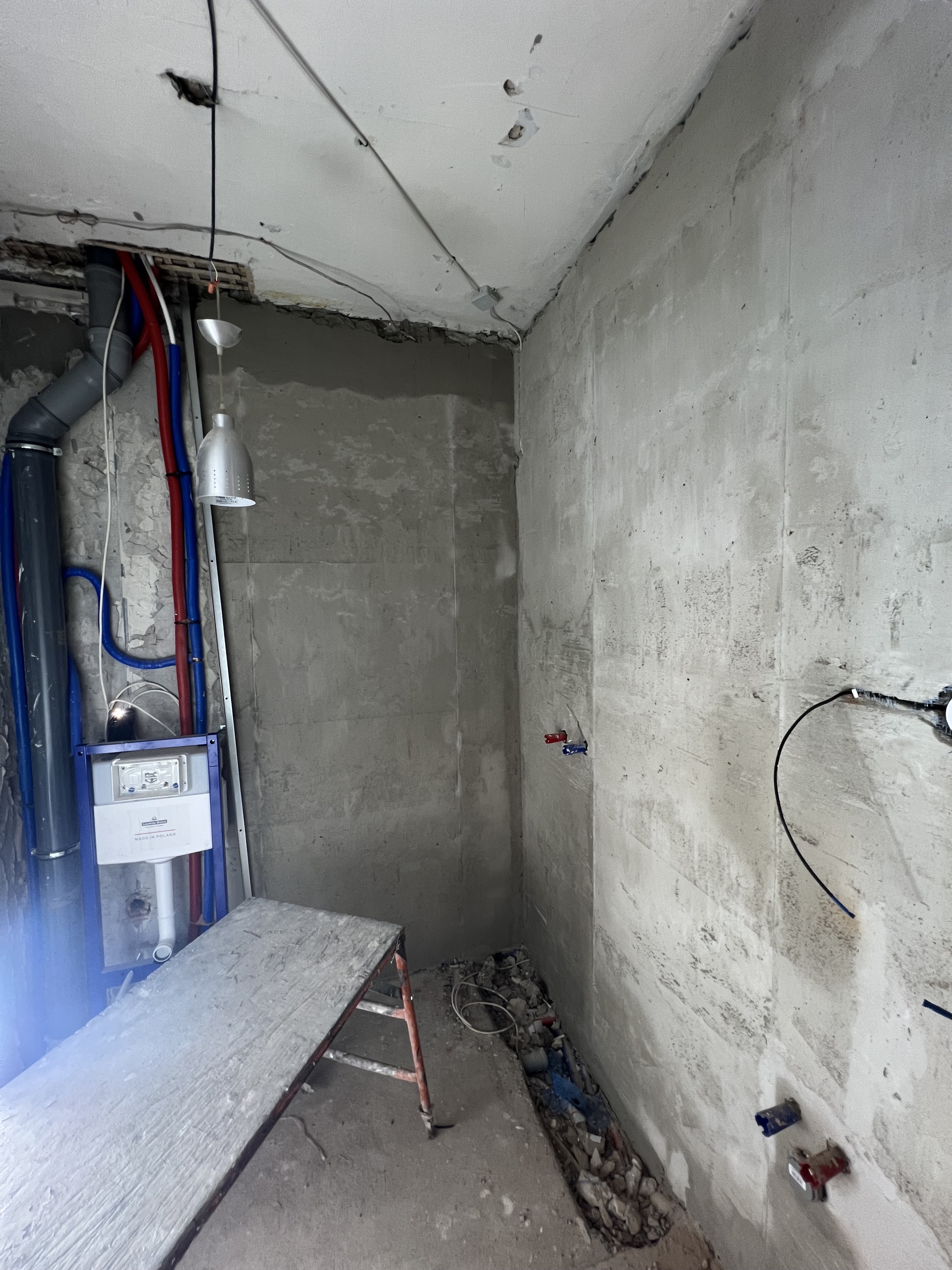 Пришлось все демонтировать🙂 Затем провести сантехнические работы, работы по модернизации системы отопления (теплый пол), залить стяжку и поштукатурить.