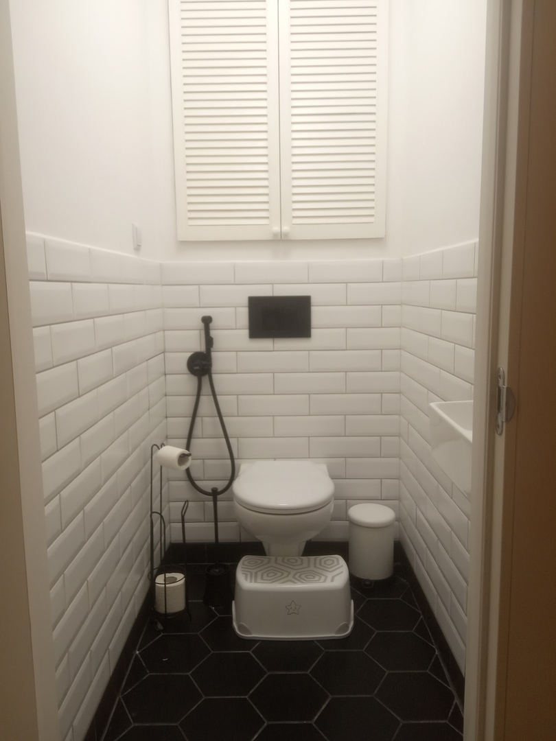 Еще в процессе планирования была мечта убрать стиралку с кухни в ванную. Для этих целей присматривали специальную плоскую раковину над стиралкой, чтобы сэкономить место. Такие специальные раковины в магазинах стоят овер дофига денег, соответственно таких сумм в нашей смете не было заложено. Поэтому шерстили авито в надежде найти нужную раковину подешевле. И таки нашли плоскую Santek с плоским сифоном за 3,5к(?) Лежала она в углу комнаты пару недель, ждала своего часа и таки дождалась. После готовности пола сначала примерили раковину – норм. Измерили ширину, глубину, высоту стиралки – норм. Кое-как вытащил стиралку (пришлось подразобрать кухонный гарнитур). Дотащил до прохода в коридор и тут подвох. Стиралка не пролезает между холодильником и гарнитуром! Ппц. Даже если открыть дверцы холодильника, то все равно не хватает пару см. Попытался героически приподнять стиралку над гарнитуром, но силы мои меня подвели. Единственное решение, пришедшее в голову, это вытащить холодильник в коридор после входа в ванную. Окей, вытащили кое-как холодильник, перетащили стиралку и тут нас ждал сюрприз. Ошибка в расчетах. Неучтенные данные. Когда все измерял я не учел, что сзади еще идут трубы канализации и водопровода. Поэтому стриралка торчит примерно на 5 см. Ппц! Ну тут сам косяк.