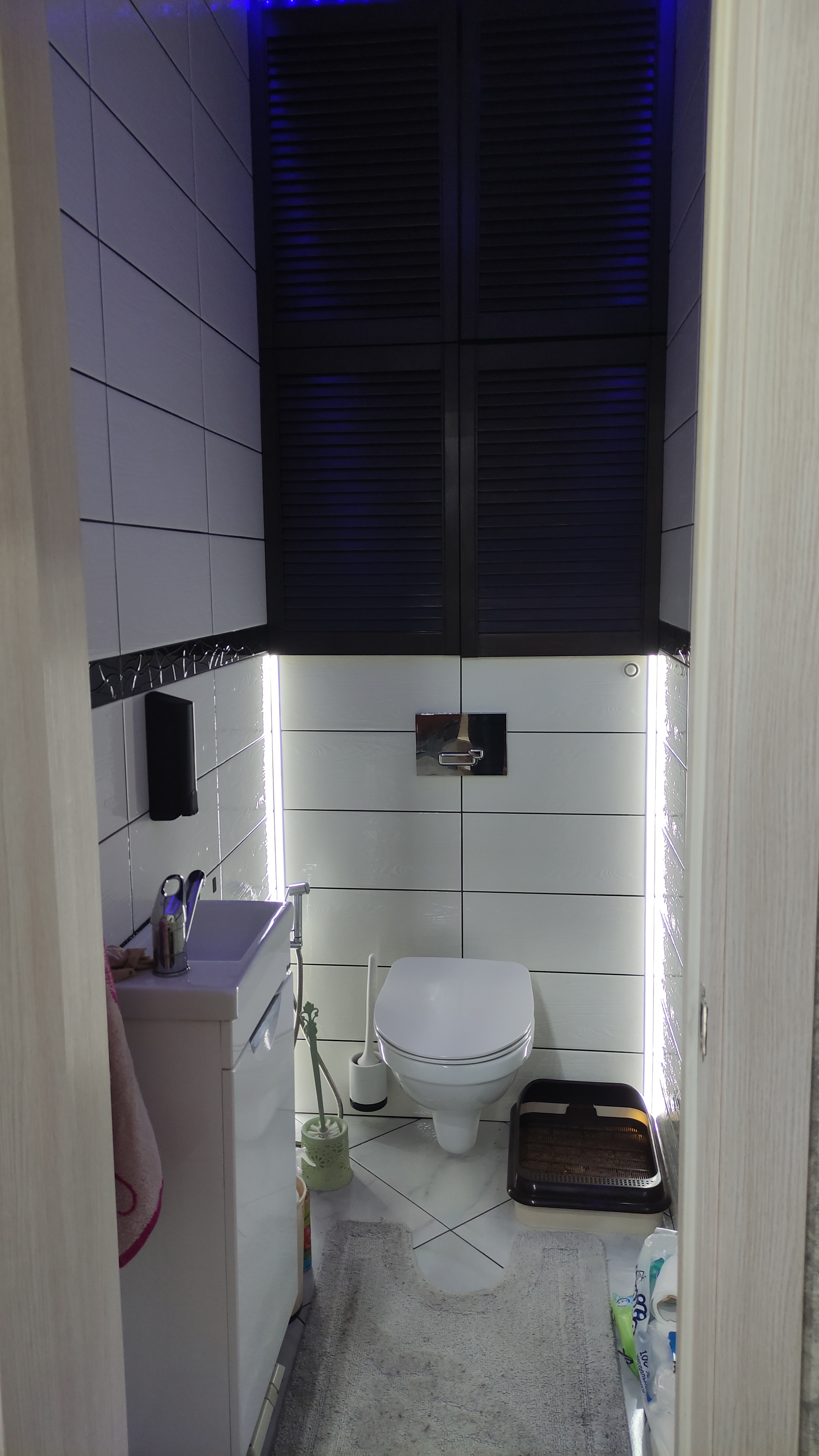Со шкафом самое интересное. После долгих обдумываний пришел к выводу, что лучше и проще сделать полку прямо в шкафу с розеткой, выключателем вытяжки и регулятором теплого пола. Чтобы все было в одном месте. И 3 полки в нем для всей бытовой химии и запаса туалетной бумаги (как показало время самое ценное, даже ценнее гречки)). При попытке заказать у частников адекватного ценника мы не нашли, поэтому решено делать самому. Проф инструмента у меня нет, поэтому использовал только электролобзик и шуруповерт. Ожидаемо итоговый результат получился не идеальный, но и цена вопроса намного ниже