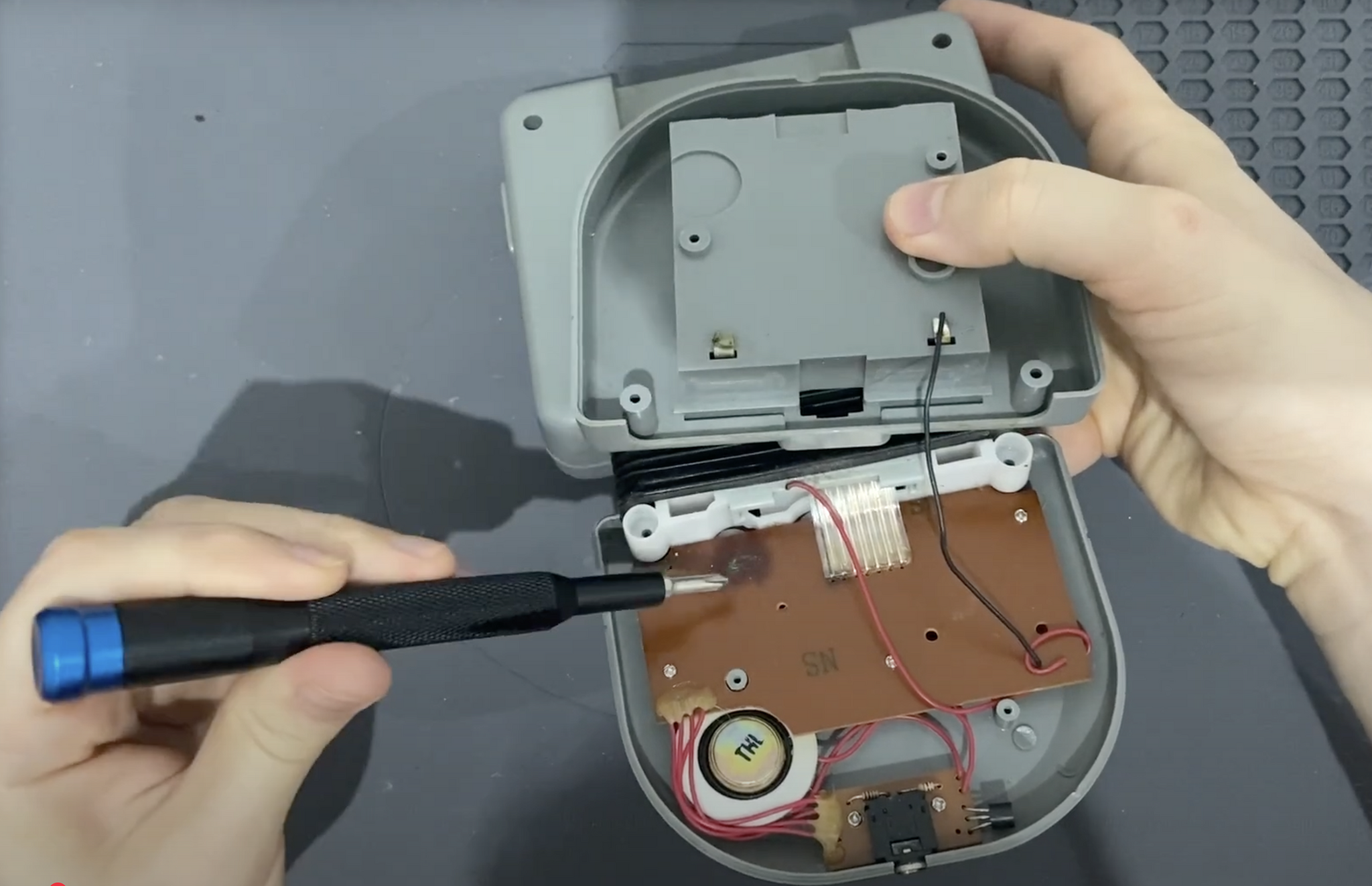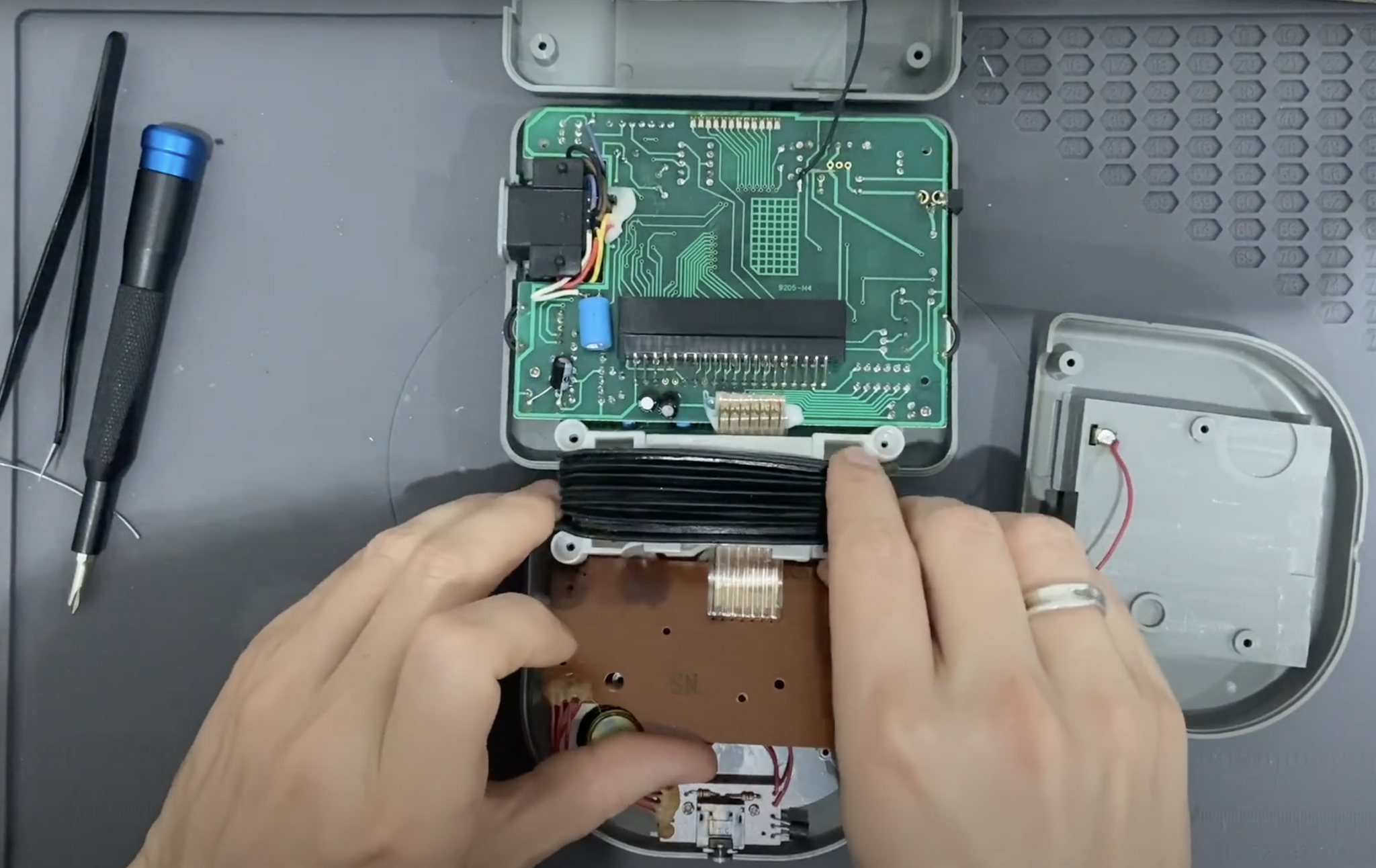 Снова разбираю нижнюю часть и открываю верхнюю, чтобы добраться до контактов светодиода и проследить всю цепь питания. Консоль продолжает удивлять. Как вам крепление разъёма слева сверху? Или чёрный провод земли в верхней части? По разным оценкам было продано от 100 000 до 500 000 таких консолей, но электроника тут - как из гаража за магазином радиоэлектроники.