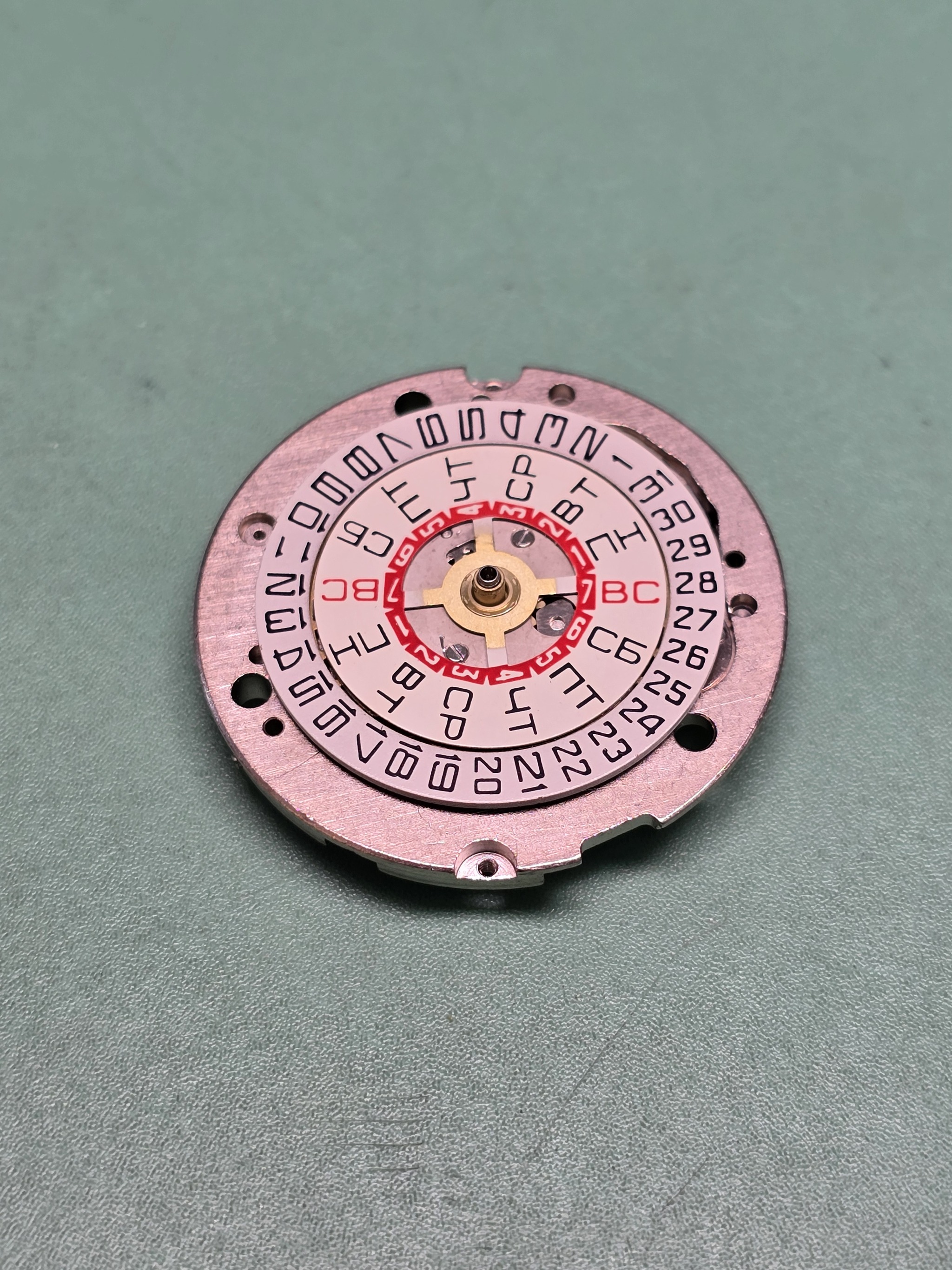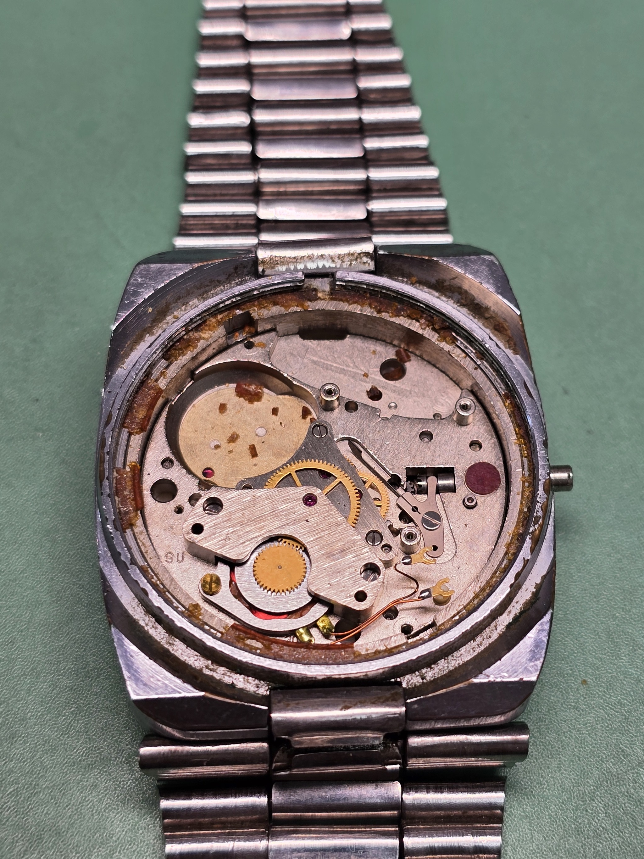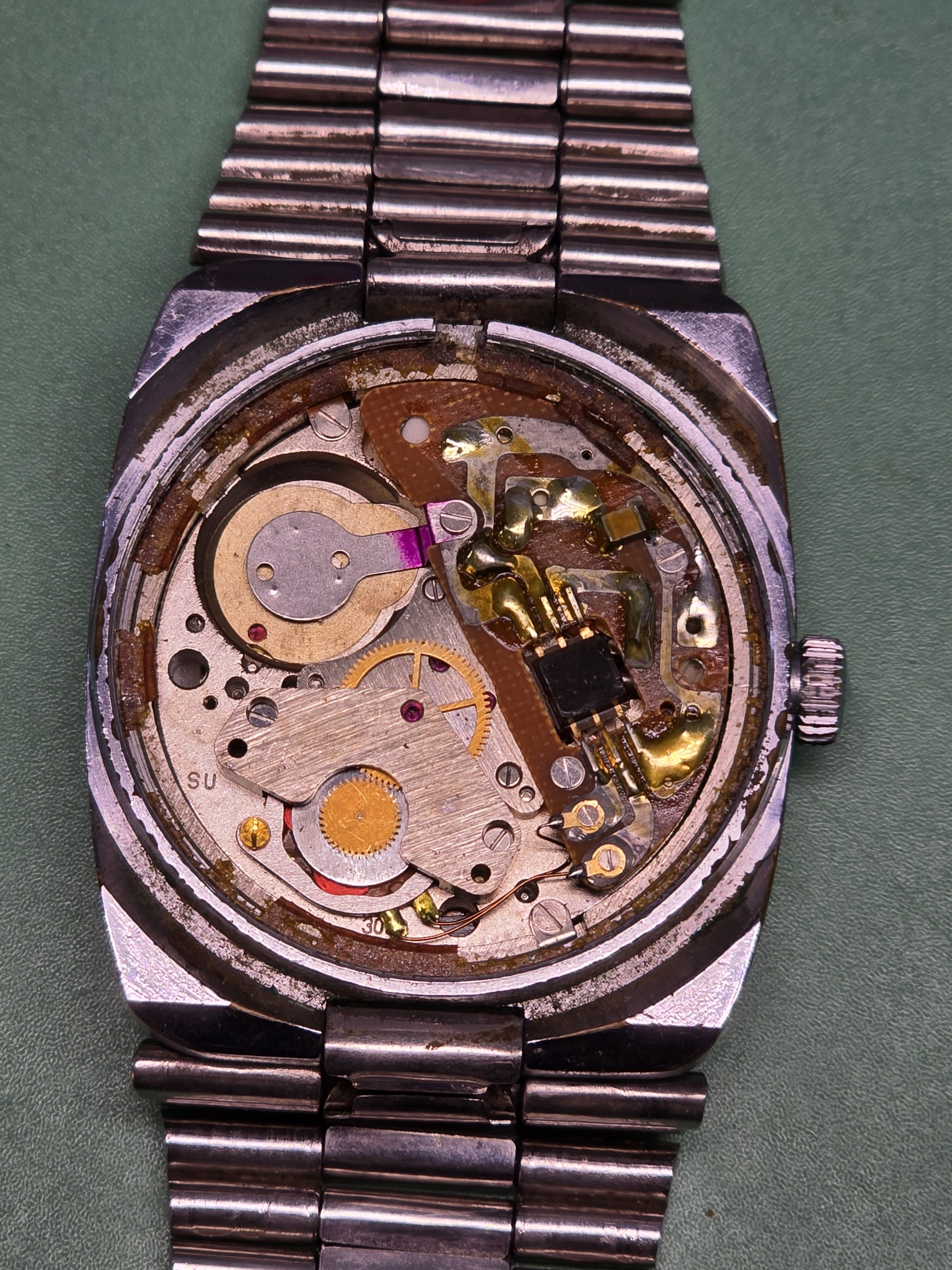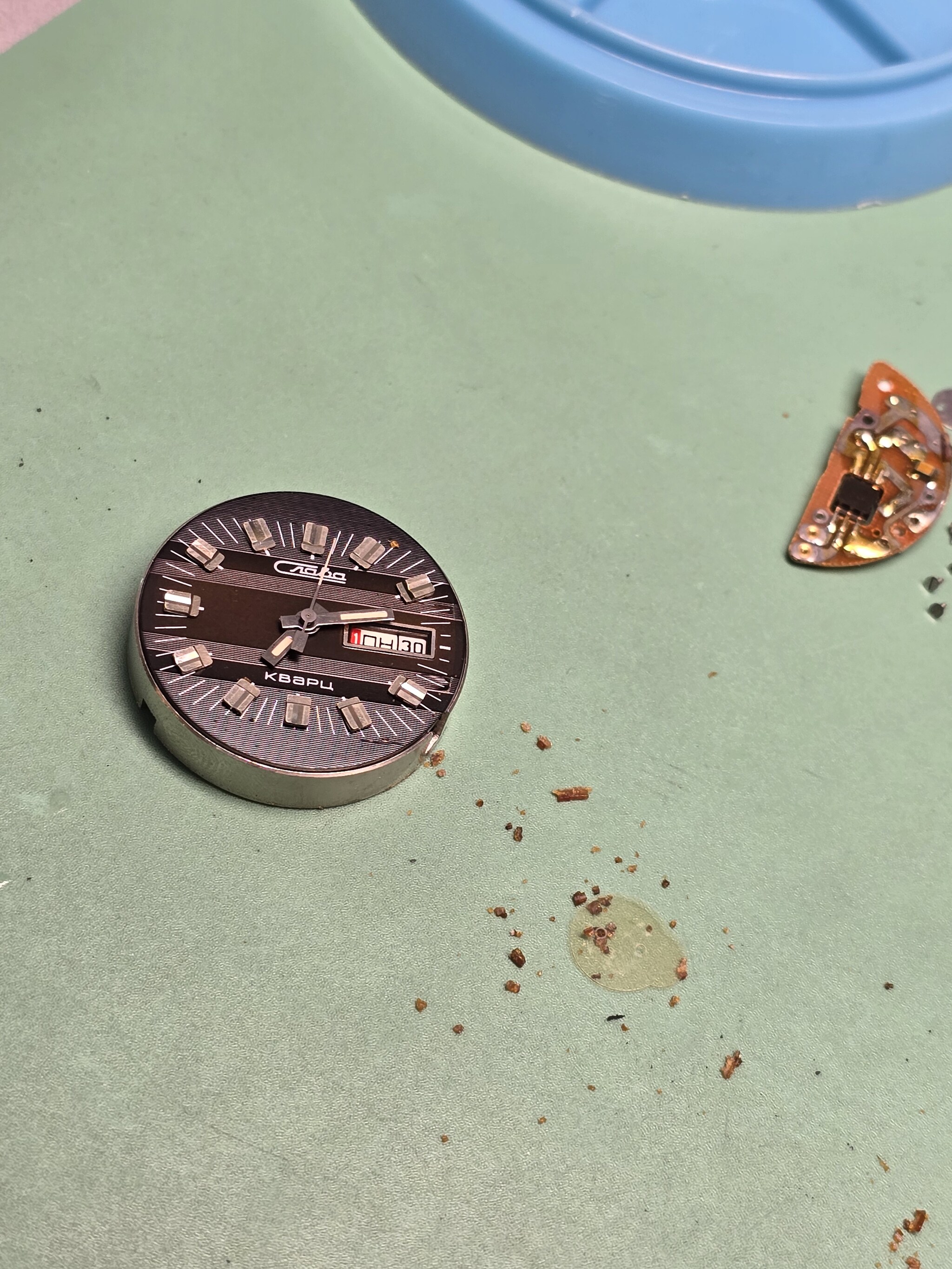 В общем случае, механизм должен выпасть из корпуса сам, но останки прокладки не позволяют ему это сделать. Пришлось снять нежные детали и приложить некоторые усилия, чтобы достать святая святых - калибр Слава 3050 и его оформление.