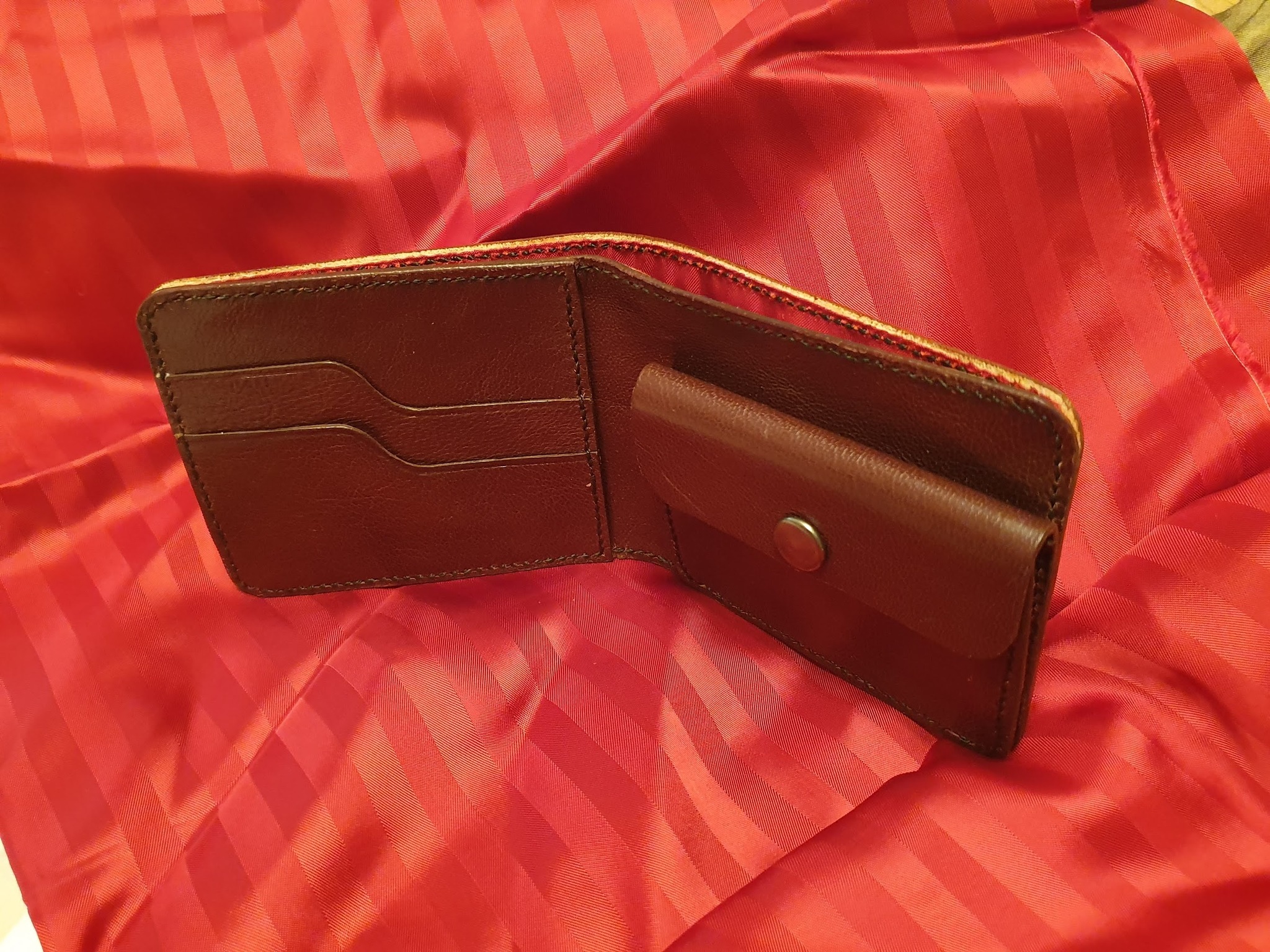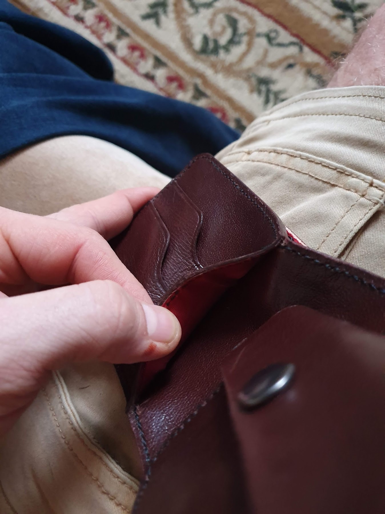 Одно отделение, нетолстая кожа (примерно 1,2 коза, примерно 1,5 мм корова растительного дубления), утоньшенные области склейки, нефанатичные кармашки под карты привели к тому, что бумажник получился легким и, по первому впечатлению, удобным в обращении. Потом ещё спроим у пользователя его мнение.