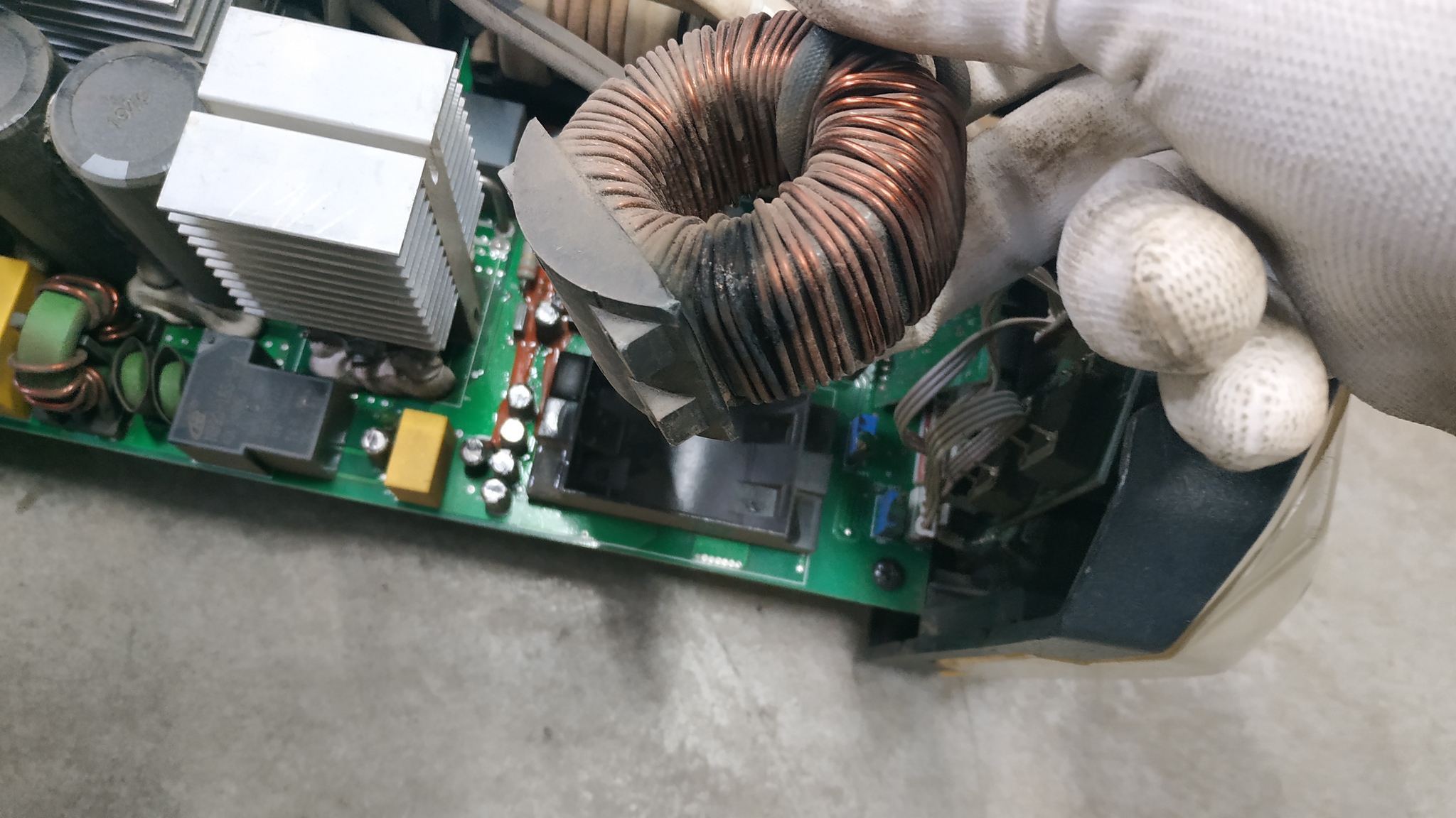 В большинстве случаем диагностики неисправности определяются при визуальном осмотре. Разобрав видим виновника всей проблемы - это выпавший из места крепления трансформатор который упал на плату управления и вследствие чего замкнул. Скорее всего такое произошло из-за падения или удара.