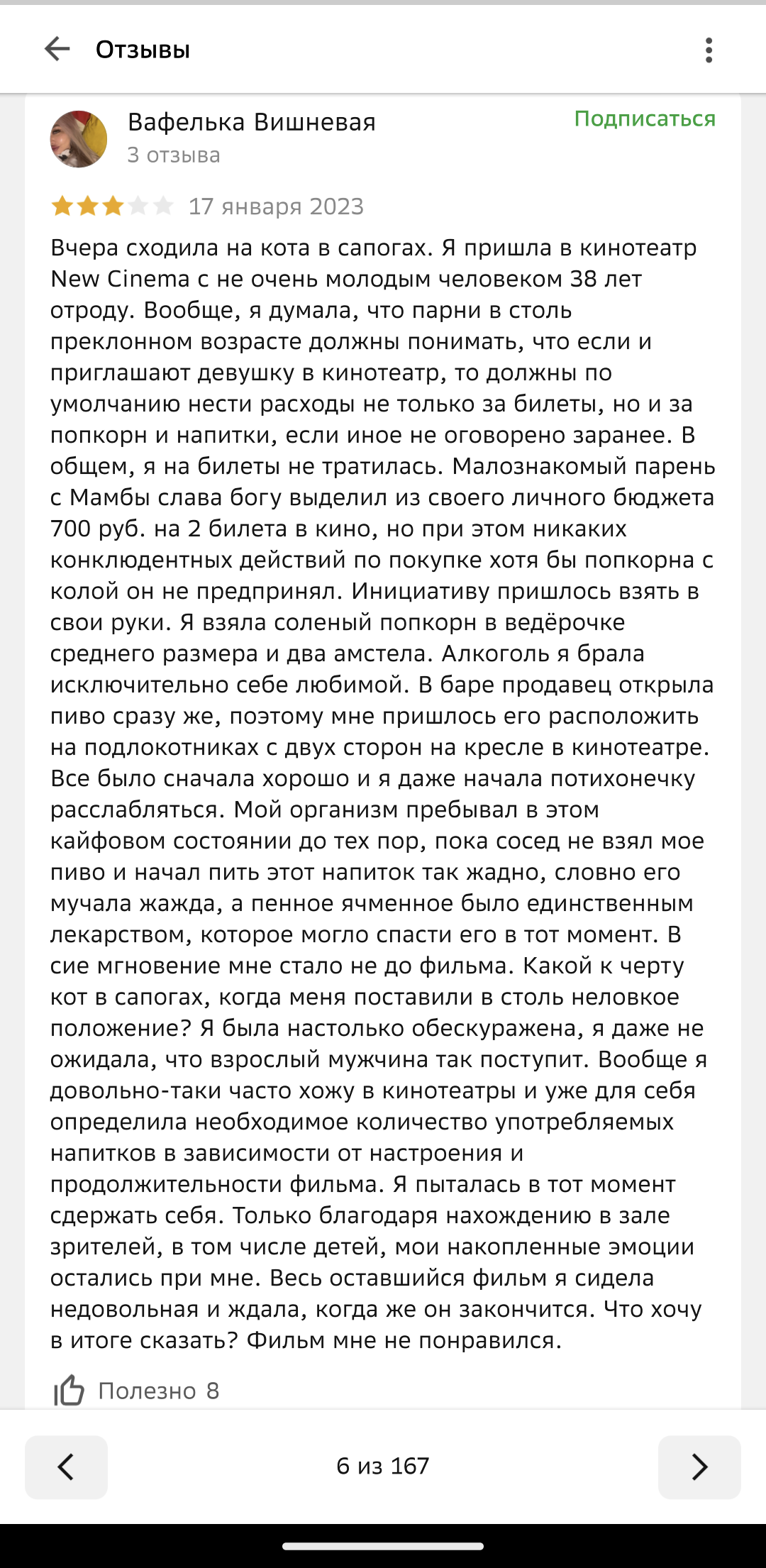 56 Chamarat Решил почитать отзывы на кинотеатр 2 года назад ..а там драма! Как говорится: "В интернете никогда не знаешь, то ли перед тобой тролль, то ли просто идиот". Слог то какой! Кинотеатр Свидание Девушки Длиннопост Отзыв Скриншот Ещё 0