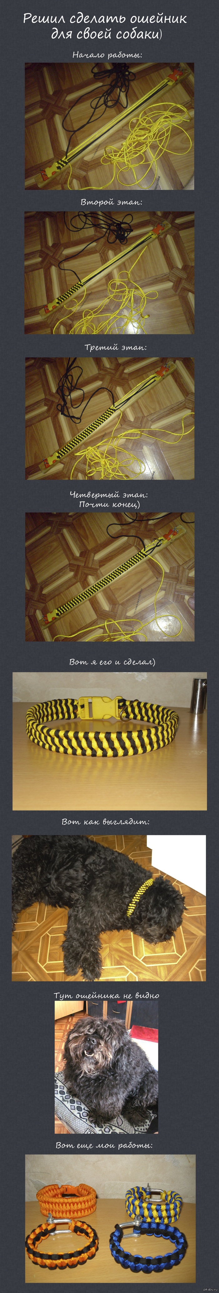 Для собак средних и больших пород, используйте металлическую фурнитуру. Карабины, пряжки, кольца, полукольца, обязательно паяные или литые. Исключите пластик и тонкую сталь. Паракорд хорош для ошейника, но помните самые слабые места всегда в элементах соединения. А так вы молодец, + вам. Я знаю о чем говорю...