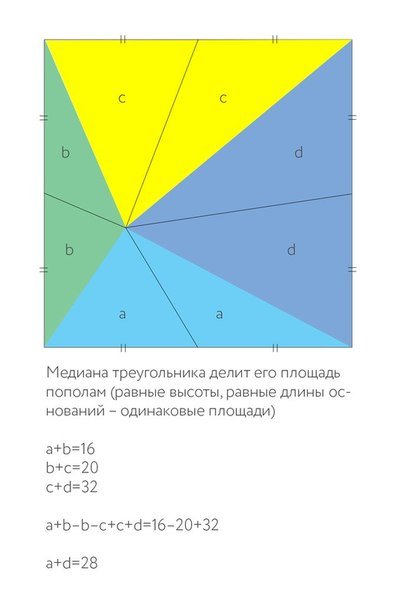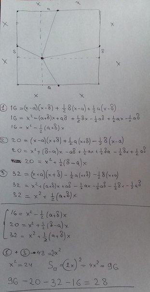 если разбить весь квадрат на 4 квадрата, то можно предположить что площадь каждого такого квадрата будет 25 см2, следовательно площадь большого квадрата будет = 100. Можно сделать вывод, что площадь искомой фигуры будет равна 100 - (20 + 32 + 16) = 32 см2.