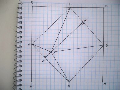 Докажем что сумма площадей двух противолежащих четырехугольников AEOH и CGOF -- константа. Для этого проведем дополнительное построение: проведем EH и FG. Рассмотрим AEOH. Его площадь складывается из двух треугольников: AEH и EOH, причем площадь EOH зависит только от высоты OM. Рассуждая аналогично для четырехугольника CGOF делаем вывод что площадь FGO зависит только от ON. Так как основания треугольников EOH и FOG равны, сумма их площадей будет равна (MO+ON)FG/2 где MO+ON=MN=const, FG -- const следовательно сумма площадей противолежащих четырехугольников -- константа.