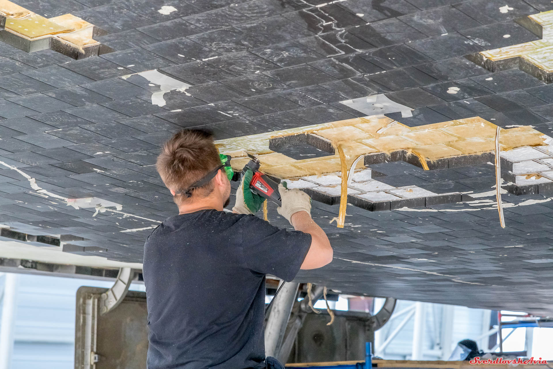 Демонтируются для реставрации поврежденные защитные плитки, зачищается поверхность на месте их крепления.