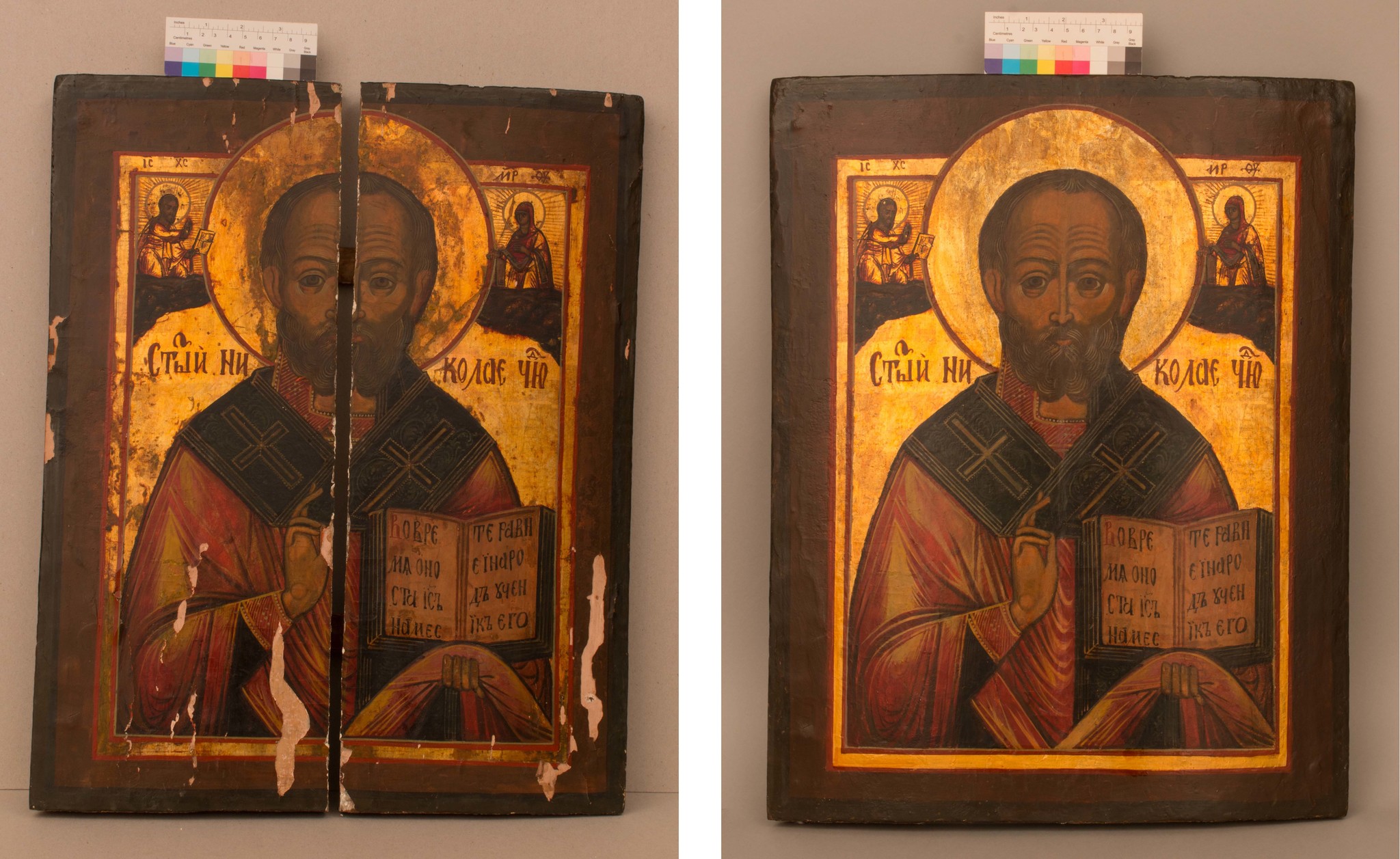 Мы работаем в Санкт-Петербурге, и реставрация икон является так же одним из наших основных направлений. По этому можете обратиться к нам. Для определения стоимости реставрации нужно прислать фотографии на почту restm1@yandex.ru . Потребуется фотографии общего вида (икона целиком), желательно с лицевой и оборотной стороны, и фотографии каких то фрагментов с наибольшими повреждениями(например как та что Вы сейчас прислали в комментарии). И укажите размер иконы, так как фотография не передаёт масштаб. И я подготовлю для Вас полноценный конструктивный ответ. Примеры выполненных нами работ по реставрации икон можете посмотреть здесь https://www.restm1.ru/restavraciya-ikon