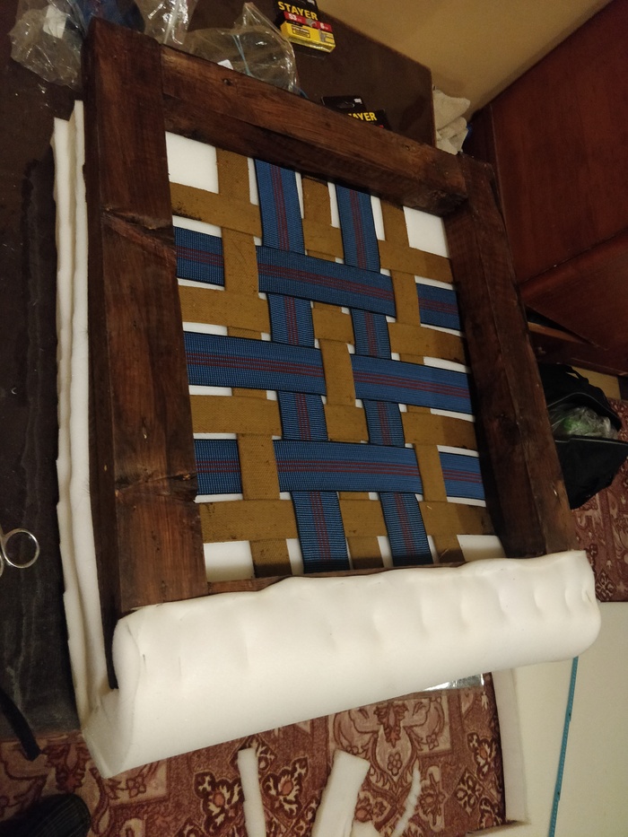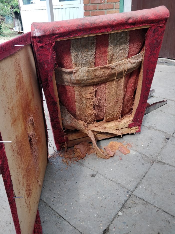 Далее, что я сделал так это все почистил, вытащил множество скоб и содрал ткань с обивкой сидушки. На сидушке, кстати, тоже ленты прибиты гвоздиками, но не эластичные, а обычные стропы тканные, на вид очень прочные и даже не оторвались, я не стал с ними ничего делать.