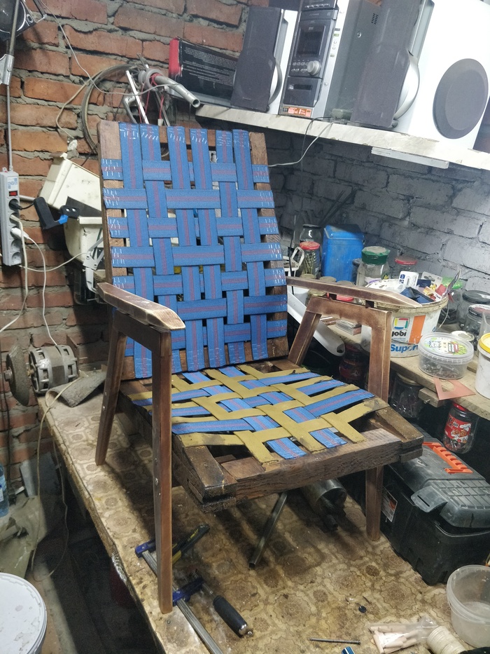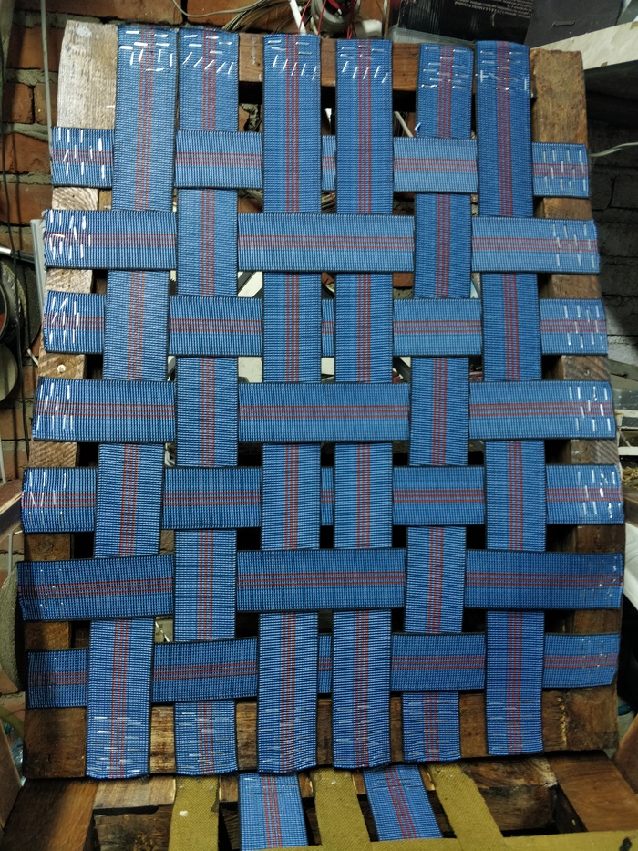 После того как забрал с пункта выдачи заказы решил натянуть мебельную ленту. Я делал так: отрезал ленты столько, чтобы в прикрепленном положении она была наполовину растянута от возможного. Один край ленты крепил тремя скобами, натягивал крепил второй край, а потом для надежности вбил побольше скоб. На сидушке, между строп, еще решил добавить мебельной ленты на всякий случай.