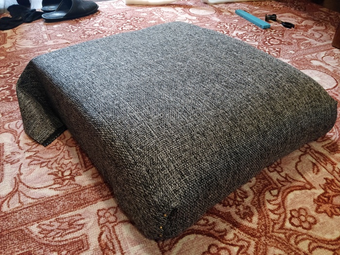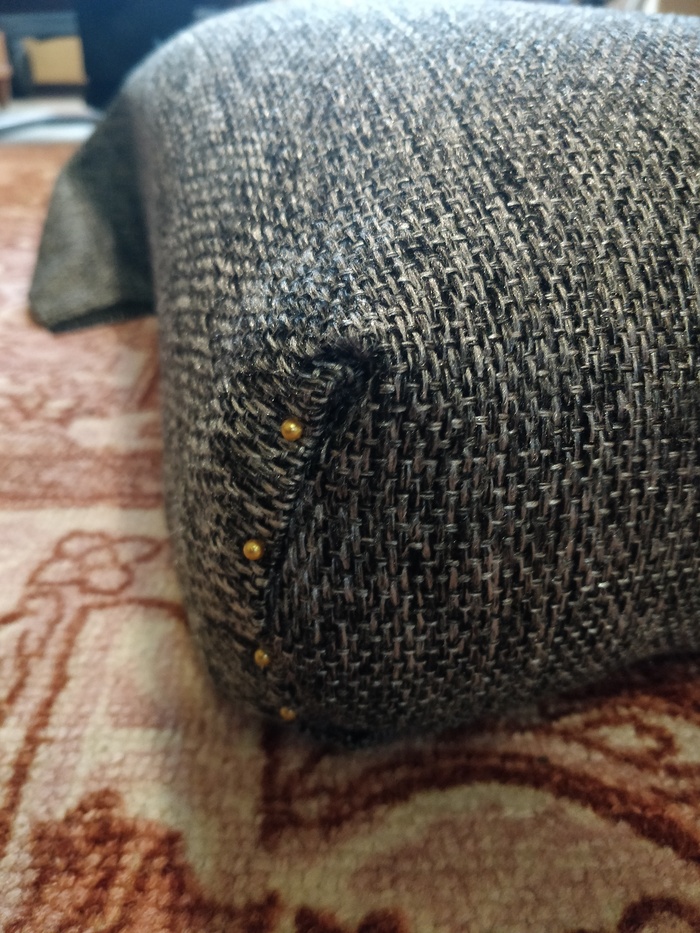 Следующий этап - это перетяжка тканью, ткань загнул и прикрепил степлером, сначала середину каждой стороны без углов по 3 скобы на сторону, затем сформировал "красивый" угол ткани, скрепил его булавками, а потом уже тщательно прикрепил степлером и углы, и стороны. Далее углы ткани были прошиты простыми стяжками серой ниткой, а булавки удалены