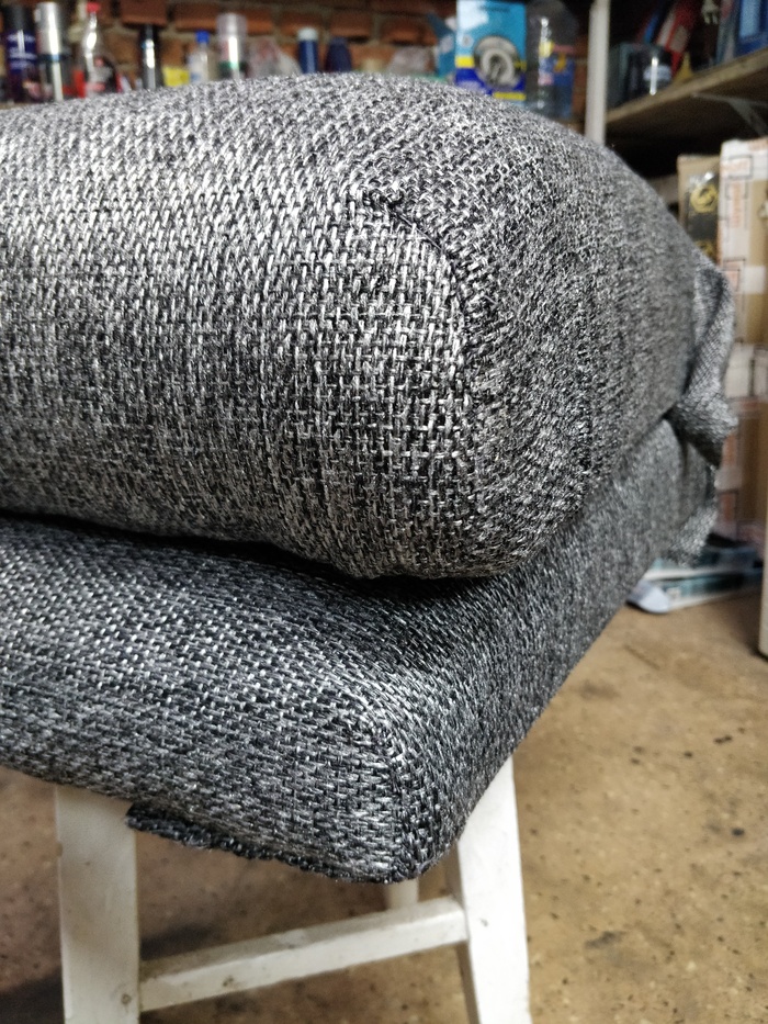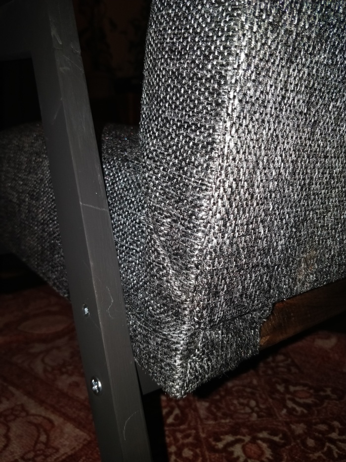 А далее я собрал все как и было добавив стык спинки и сидушки новых саморезов для усиления и уголки металлические ниже результат после сборки, а также качество окрашенной поверхности, как видно на фото - оно очень легко царапается. Также перфекционистам будет резать глаз разное направление волокон ткани сидушки и спинки (не ругайтесь):
