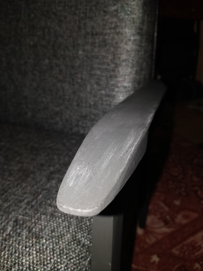 Где-то в промежутке между обивкой частей кресла, я красил ножки купленной краской (краска так себе). В инструкции на банке с краской написано, что для финишного покрытия можно использовать акриловый лак или мебельный воск. Я купил акриловый матовый лак в балончике. После того как 2ой слой краски высох я взял одну ножку и начал покрывать лаком и все испортил, хотя меня предупреждали, что лучше попробовать на незаметном месте, но я не послушал. В итоге покрытие красивого графита стало неравномерно белёсым с разводами. Пришлось после высыхания брать шлиф машинку и все счищать и заново красить. А сфоткать результат порчи я конечно же забыл.(((