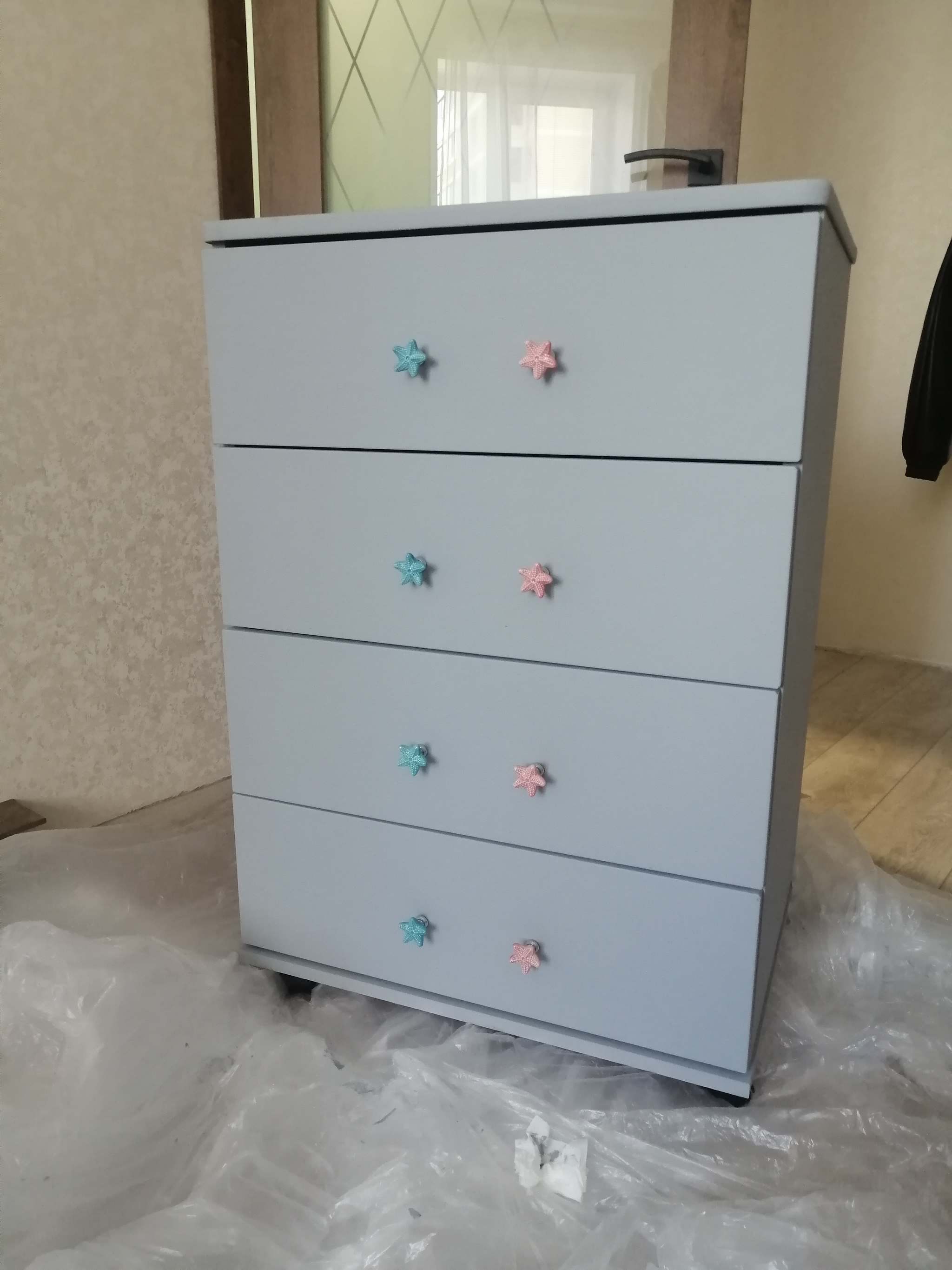 Где-то в промежутке между обивкой частей кресла, я красил ножки купленной краской (краска так себе). В инструкции на банке с краской написано, что для финишного покрытия можно использовать акриловый лак или мебельный воск. Я купил акриловый матовый лак в балончике. После того как 2ой слой краски высох я взял одну ножку и начал покрывать лаком и все испортил, хотя меня предупреждали, что лучше попробовать на незаметном месте, но я не послушал. В итоге покрытие красивого графита стало неравномерно белёсым с разводами. Пришлось после высыхания брать шлиф машинку и все счищать и заново красить. А сфоткать результат порчи я конечно же забыл.(((