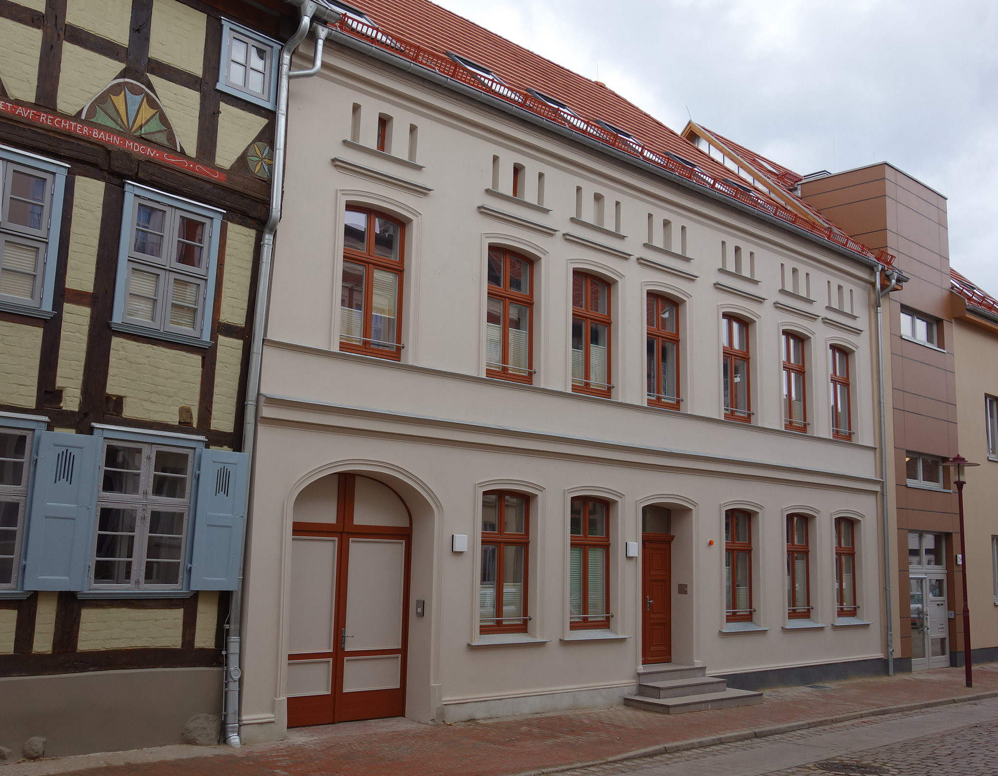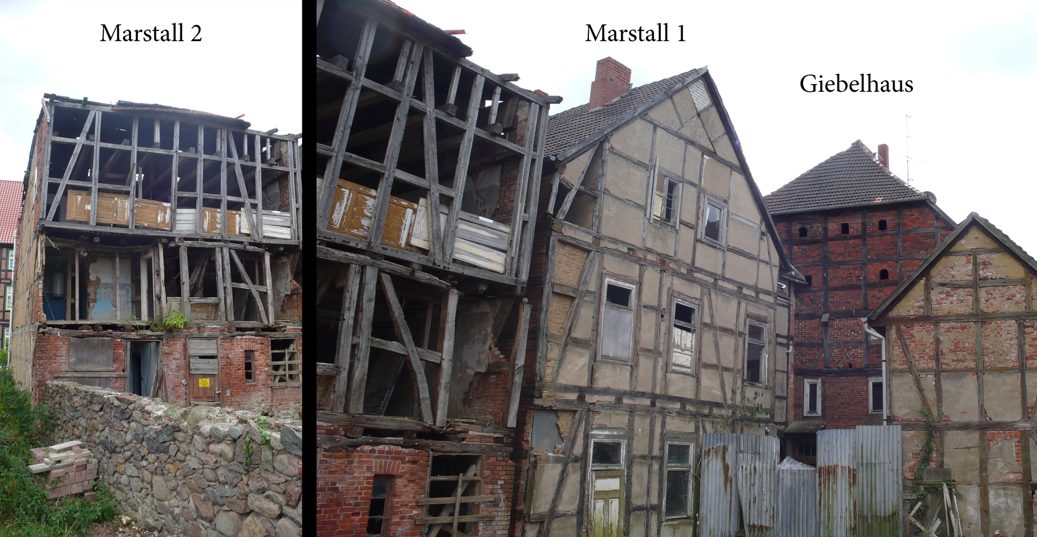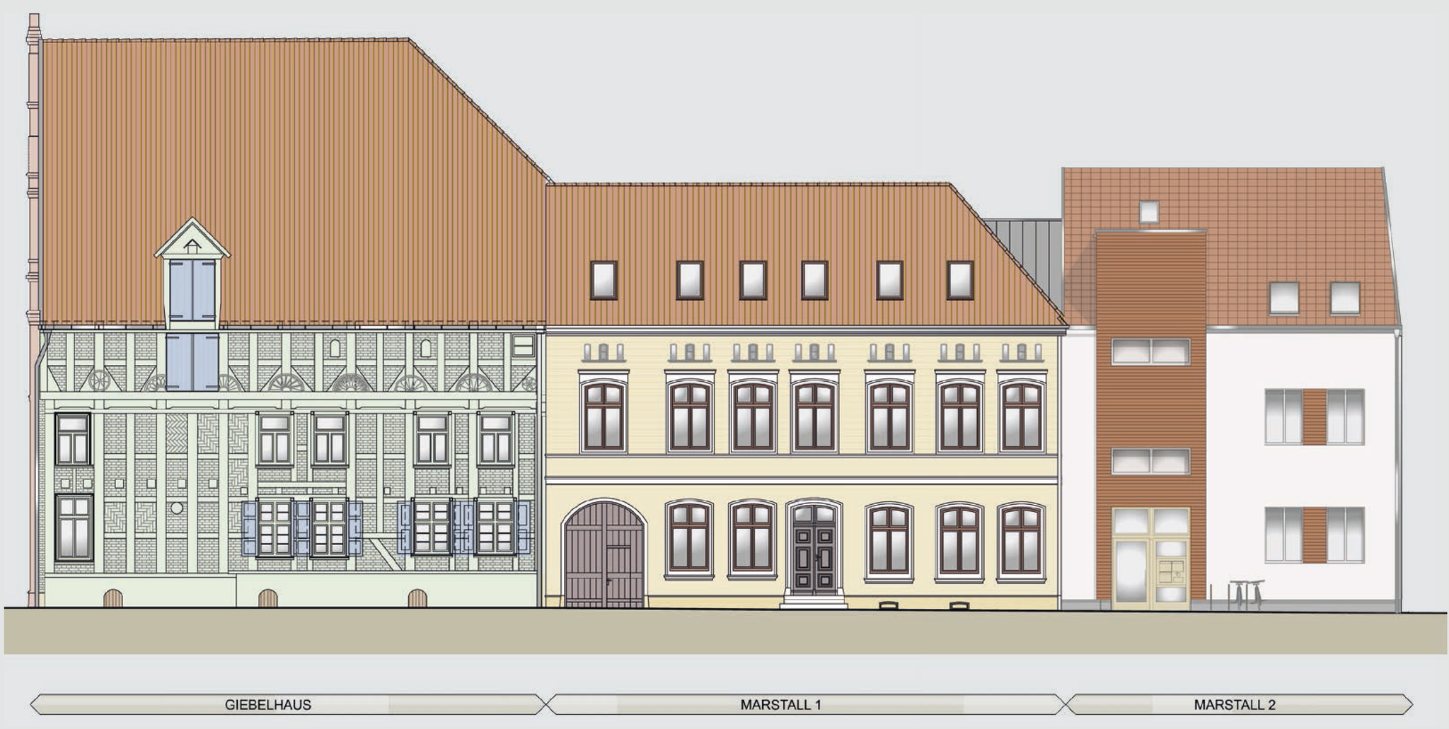 Двухэтажный жилой дом по адресу Marstall 1 с массивным фасадом, направленным к улице, имел большие повреждения деревянных конструкций, которые были заменены в ходе реставрации. Важным требованием учреждения по охране памятников было сохранение исторической лестницы. Помимо этого, были полностью сохранены исторические окна и двери, форма крыши была реконструирована, а крыша перекрыта новой черепицей. Со стороны двора к зданию были пристроены просторные балконы, важные для новых жильцов, часто имеющих пристрастие к курению.