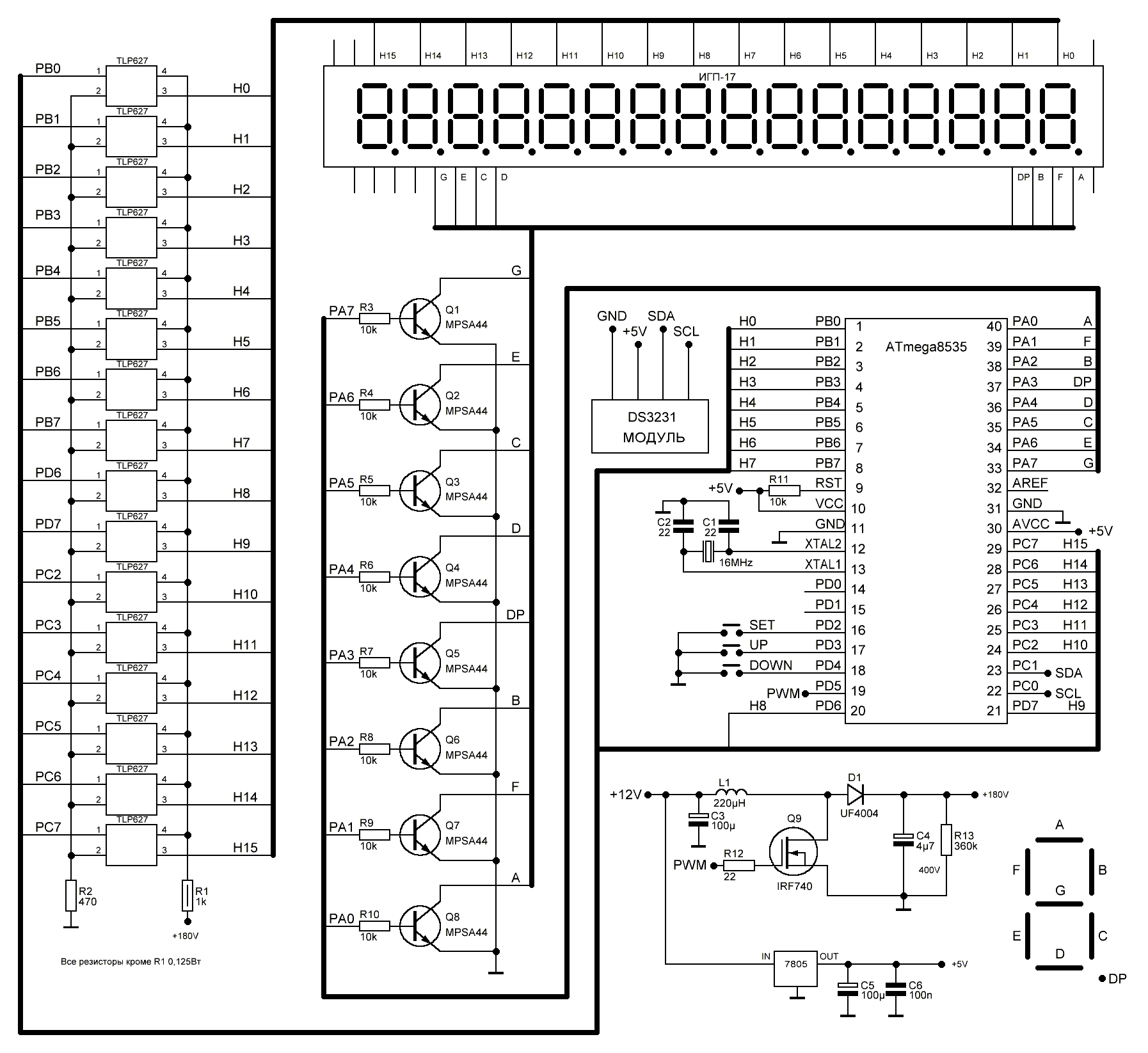 Анодами индикатора управляют оптроны TLP627, катодами (сегментами) транзисторные ключи на MPSA44. Часы питаются от постоянного напряжения +12 В, в схеме предусмотрен стабилизатор 7805 для питания микроконтроллера Atmega8535 и часов реального времени DS3231.