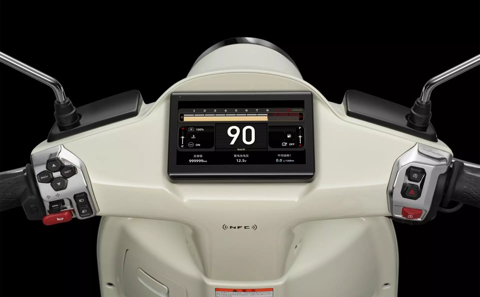 Под сиденьем находится багажное отделение, в котором помещаются два шлема с забралом. В передней части установлены крючок и грузовая площадка с допустимой нагрузкой 5 кг. В оснащение входят 6,2-дюймовый TFT-дисплей, система контроля давления в шинах, бесключевой доступ с NFC, порты для быстрой зарядки, встроенные фронтальная и задняя камеры, а также навигация на базе платформы Motoplay.