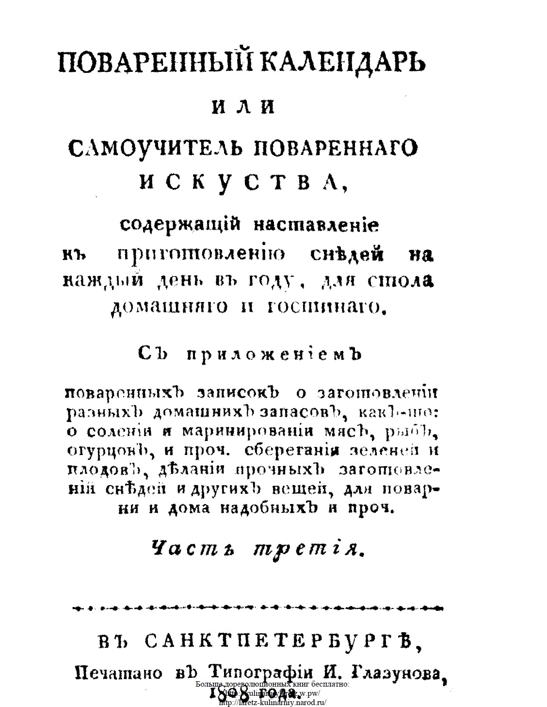 Итак, сообщаю для мимокрокодилов (мои подписчики сами помнят с чего все началось: ТЫЦ), что рецепт блюда для своего первого эксперимента в "Ретро-Кухне" был взят мною из этого (см. ниже) Поваренного календаря 1808 года издательства, часть 3-тья, месяц - август. То есть в начале 19 века, когда уже 7 лет минуло с момента свержения и убийства Павла I. И почти столько же прошло с момента коронации сына его Александра I Павловича (Благословенного). До нападения же Наполеона Бонапарта на Российскую Империю оставалось каких-то несчастных 4 года. Ссылка на скачивания книги: ТЫЦ.
