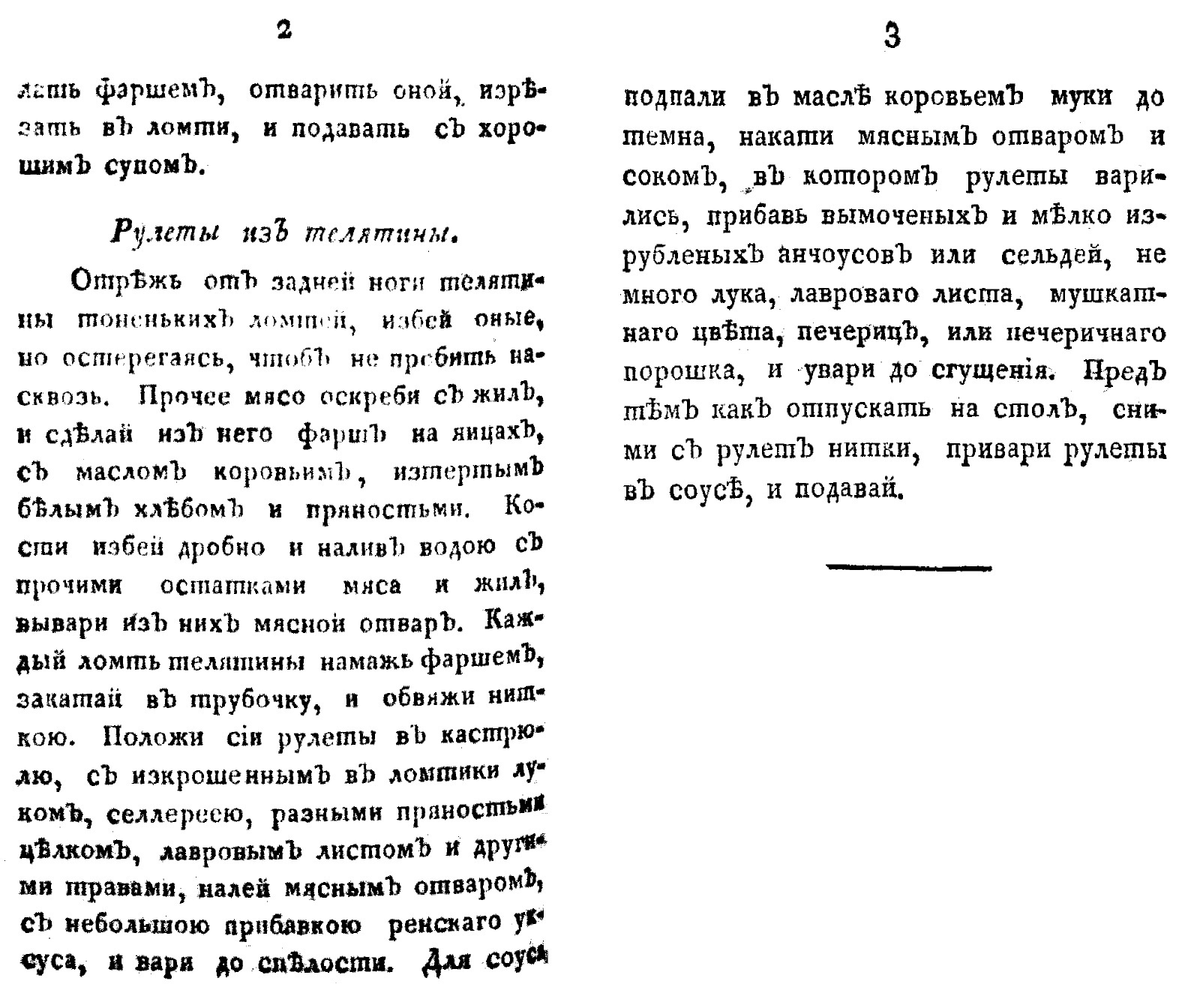 "Отрежь от задней ноги телятины тоненьких ломтей, отбей их, но остерегись, чтобы не пробить насквозь. Прочее мясо соскреби с жил и сделай из него фарш на яйцах, со сливочным маслом, истертым белым хлебом (имеются в виду сухари скорее всего или хлебные крошки) и пряностями. Кости поруби на куски и залей водою с прочими остатками мяса и жил, вывари из этого всего мясной отвар. Каждый отбитый ломоть телятины намажь фаршем, скатай в трубочку, и обвяжи ниткой. Положи эти рулетики в кастрюлю с покрошенным ломтиками луком, сельдереем, разными пряностями целиком, лавровым листом и другими травами, залей мясным отваром с небольшой добавкой винного уксуса, и вари до готовности.