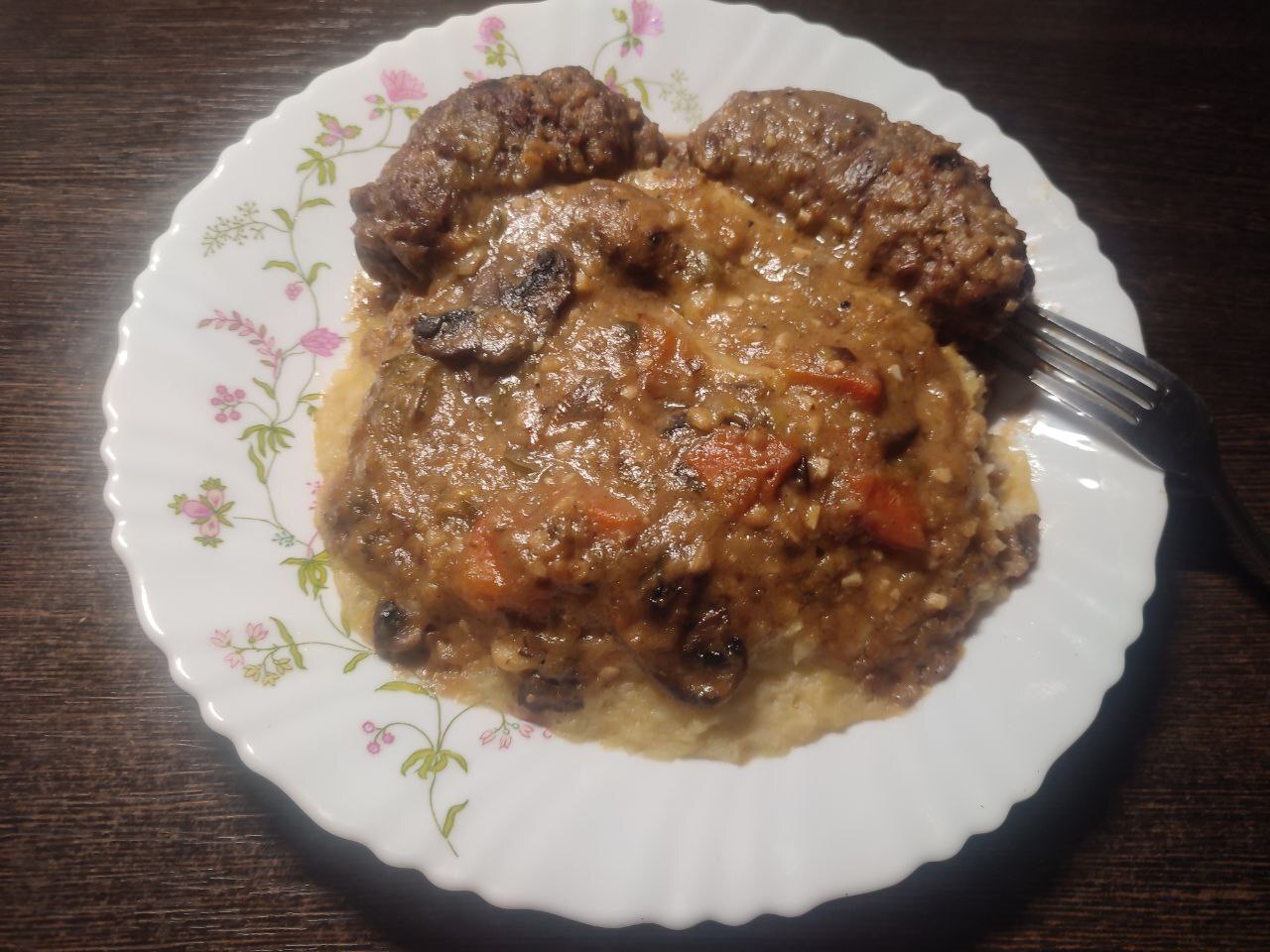 Обжарила мелко-рубленый лук-порей на сковороде, затем шампиньоны и морковь, и быстро ввела несколько половников бульона на сковороду. В бульон всыпала примерно столовую ложку сухих корней пастернака и корня петрушки, соль, перец по вкусу. А также добавила немного винного уксуса. Потушила 2 минуты и в эту юшку выложила все телячьи рулетики по кругу. Закрыла крышкой не плотно и тушила все 30 минут (далее и по п. 14 включительно - см. видео).