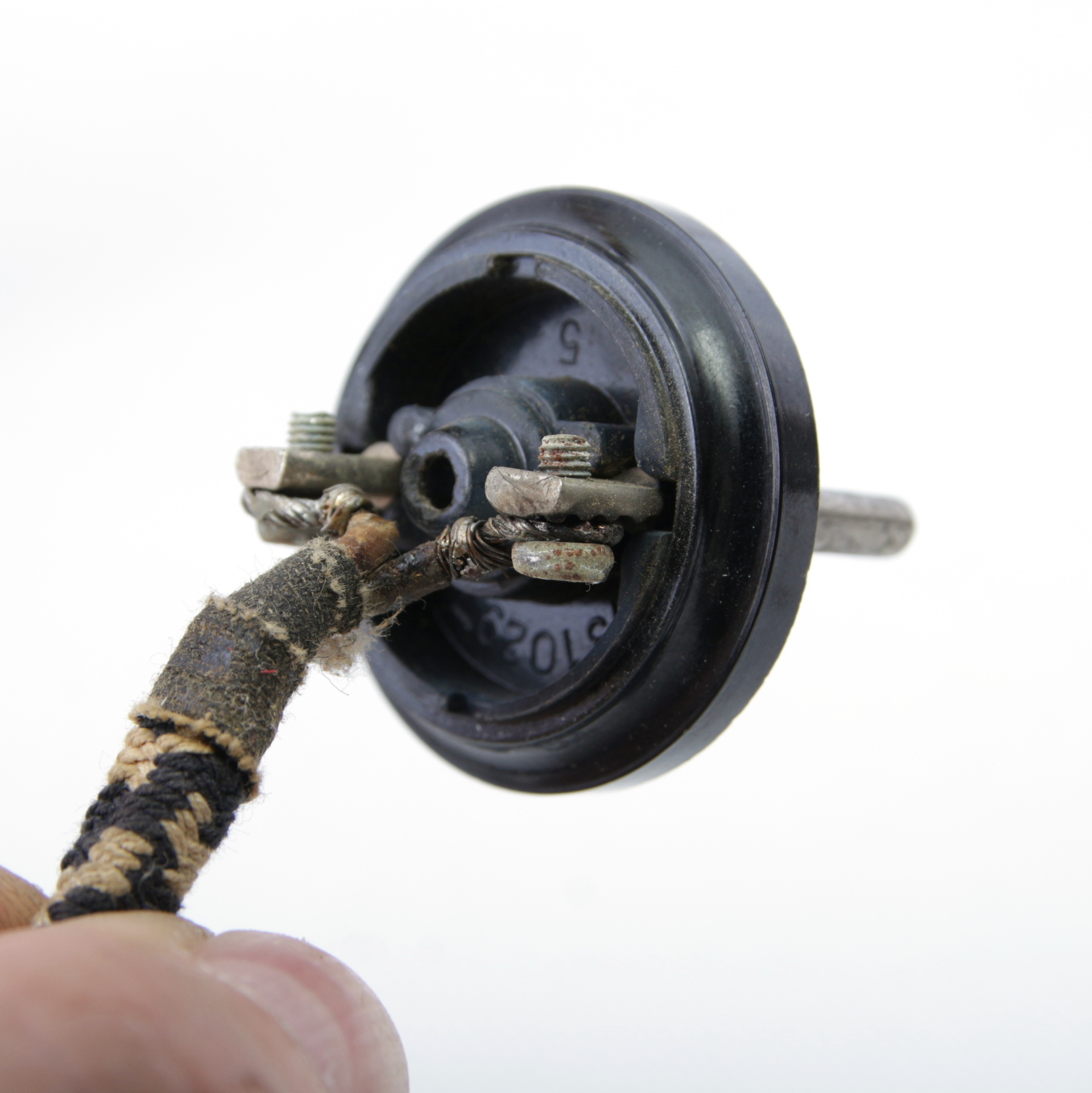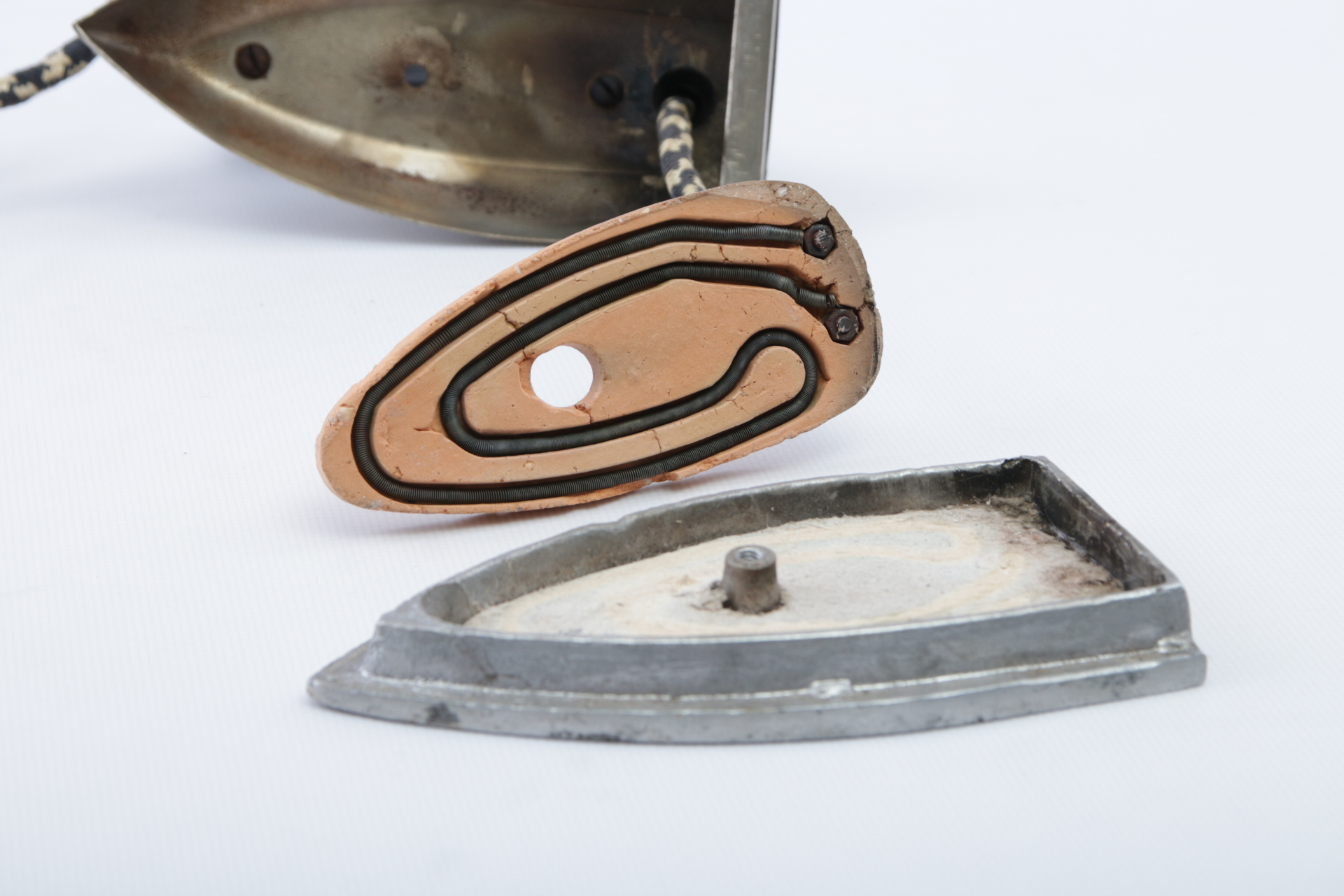 Внутри прижимная пластинка, керамическая пластина с каналом под нагреватель и асбестовая подкладка.