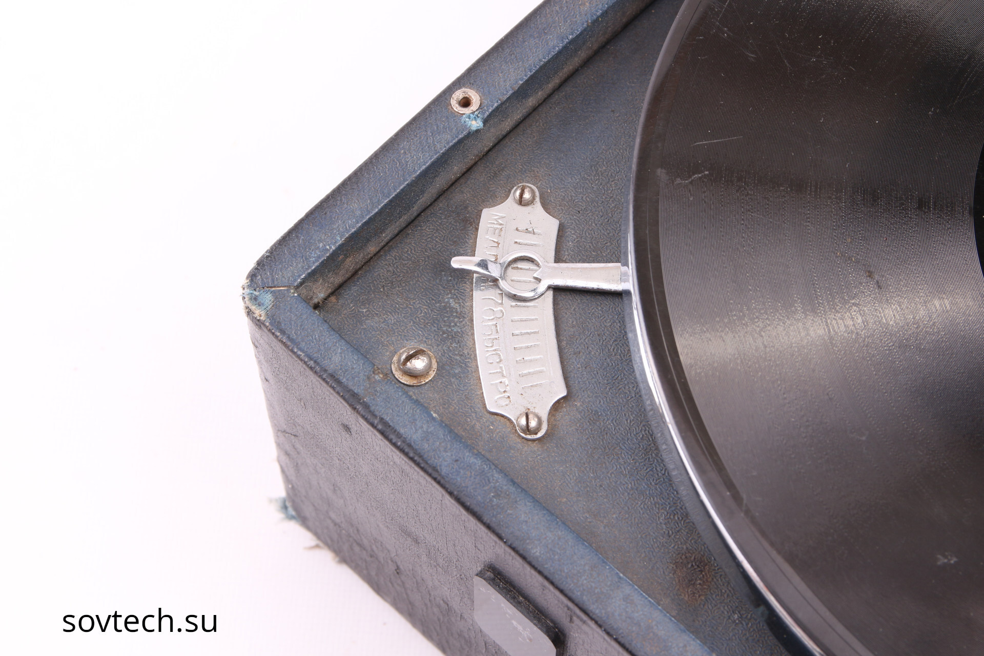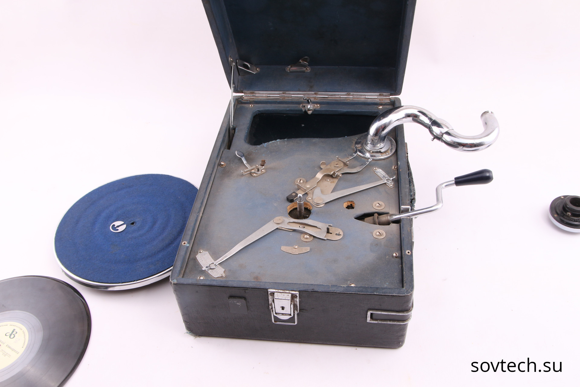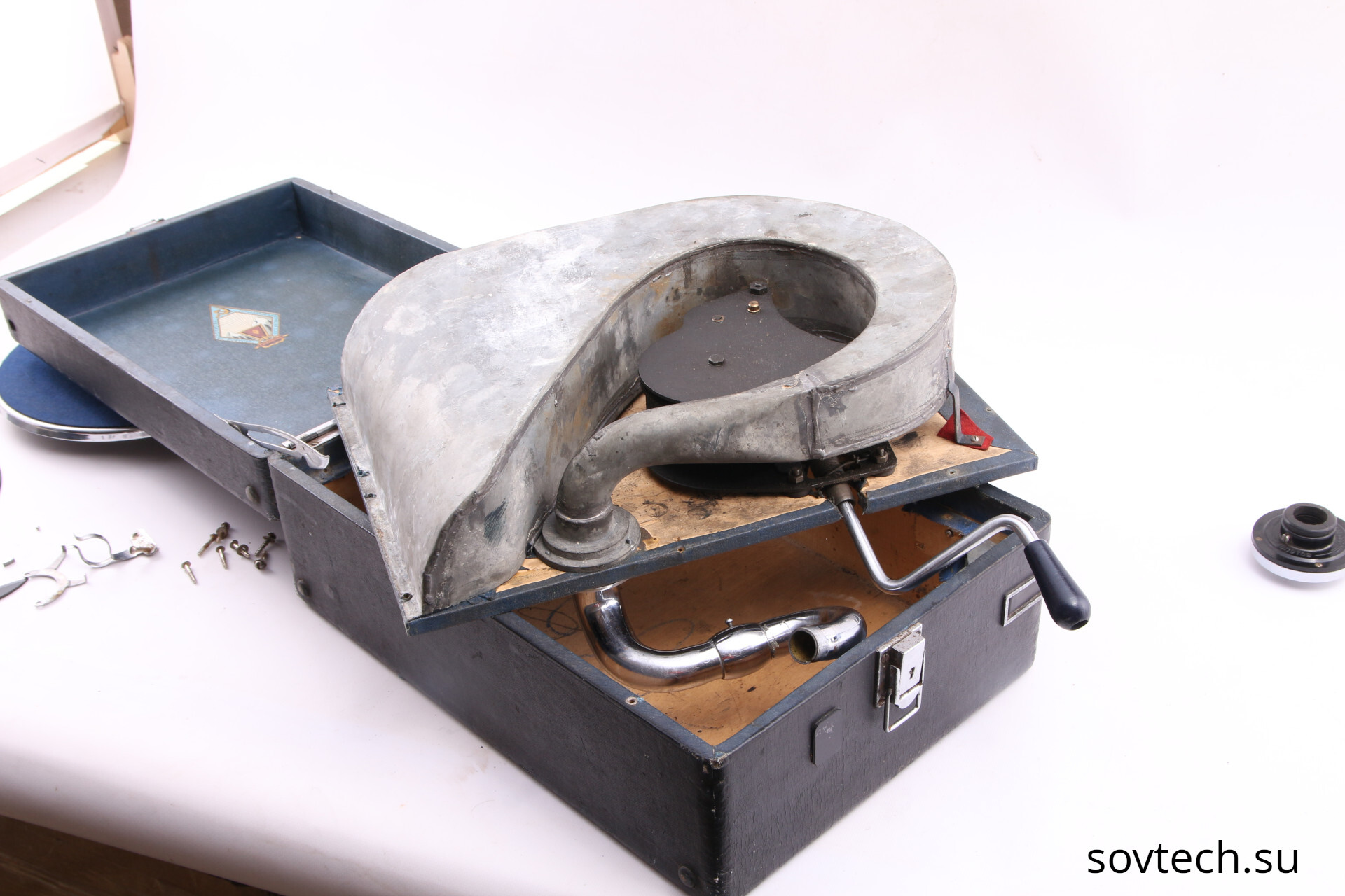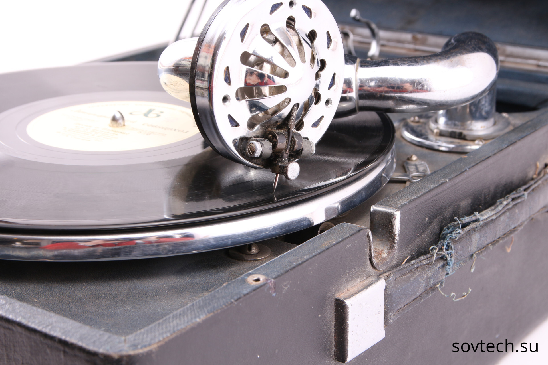 У патефонов, в отличии от граммофонов, труба резонатора спрятана внутри корпуса, в итоге он представляет собой вот такой компактный чемоданчик. Меня очень впечатляет работать с устройствами, созданными для эпохи, где электричество было далеко не везде, и для работы использовались только механика. Патефон заводился рукояткой и воспроизводил музыку с пластинки довольно громко, позволяя нарушить тишину и шум города, где цокот копыт слышался чаще звука ДВС.