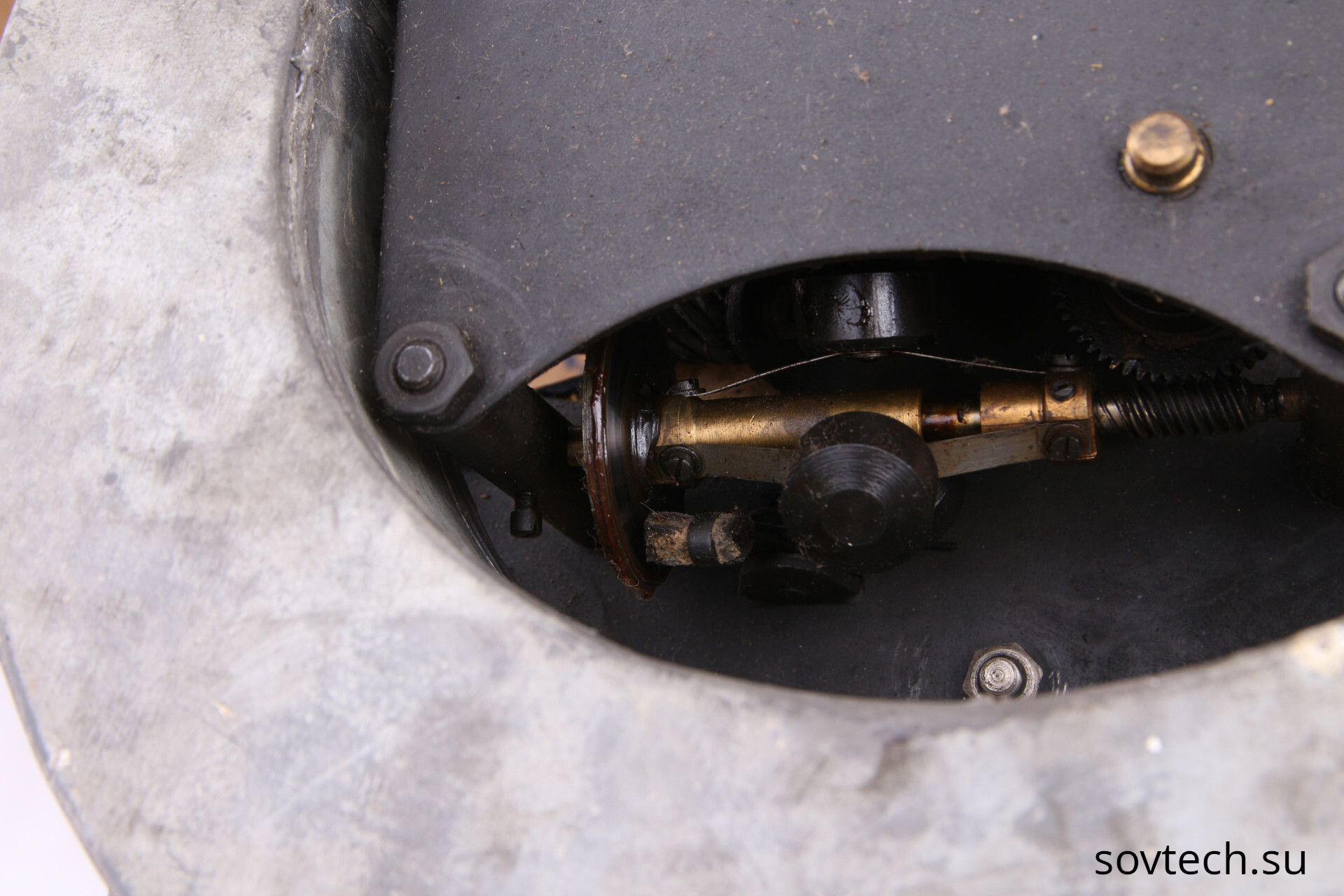 Пружинный мотор и шестеренки редуктора. Патефон как и любой механизм с пружинным мотором нужно хранить незаведенным, иначе пружина теряет свои свойства.