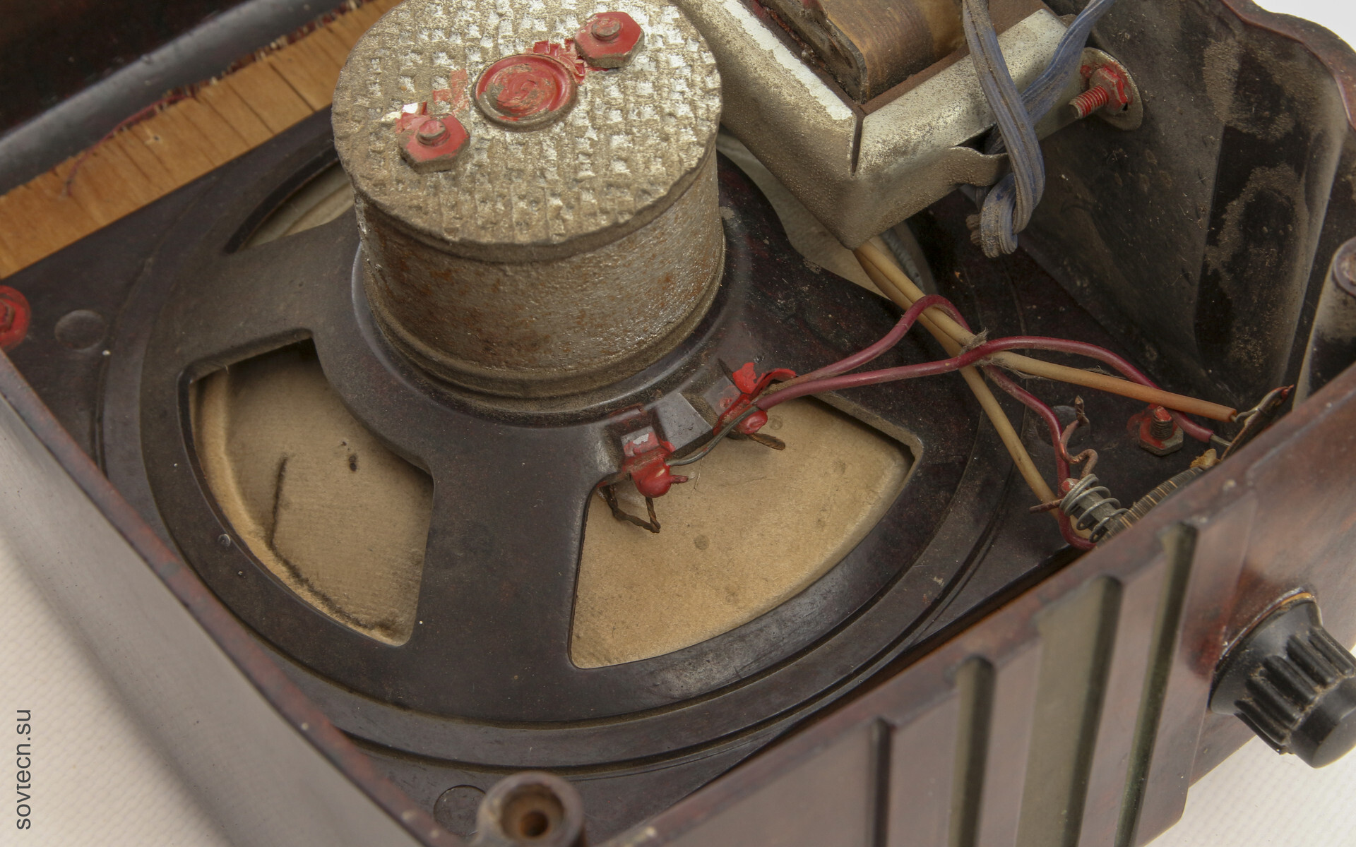 Передняя поверхность покрыта радиотканью - это акустическая ткань, рыхлая для прохождения звука, но в то же время эстетически заряженная. На фото видно, насколько плачевно ее состояние. Даже если радио хранилось пол сотни лет в хороших условиях, и ткань не порвана, часто она весьма запыленная, и из-за света потеряла прочность, и попытка почистить ее скорее всего приведет к новым разрывам. Благодаря @AthosLaFere можно представить как радиоточка выглядела с целой тканью: